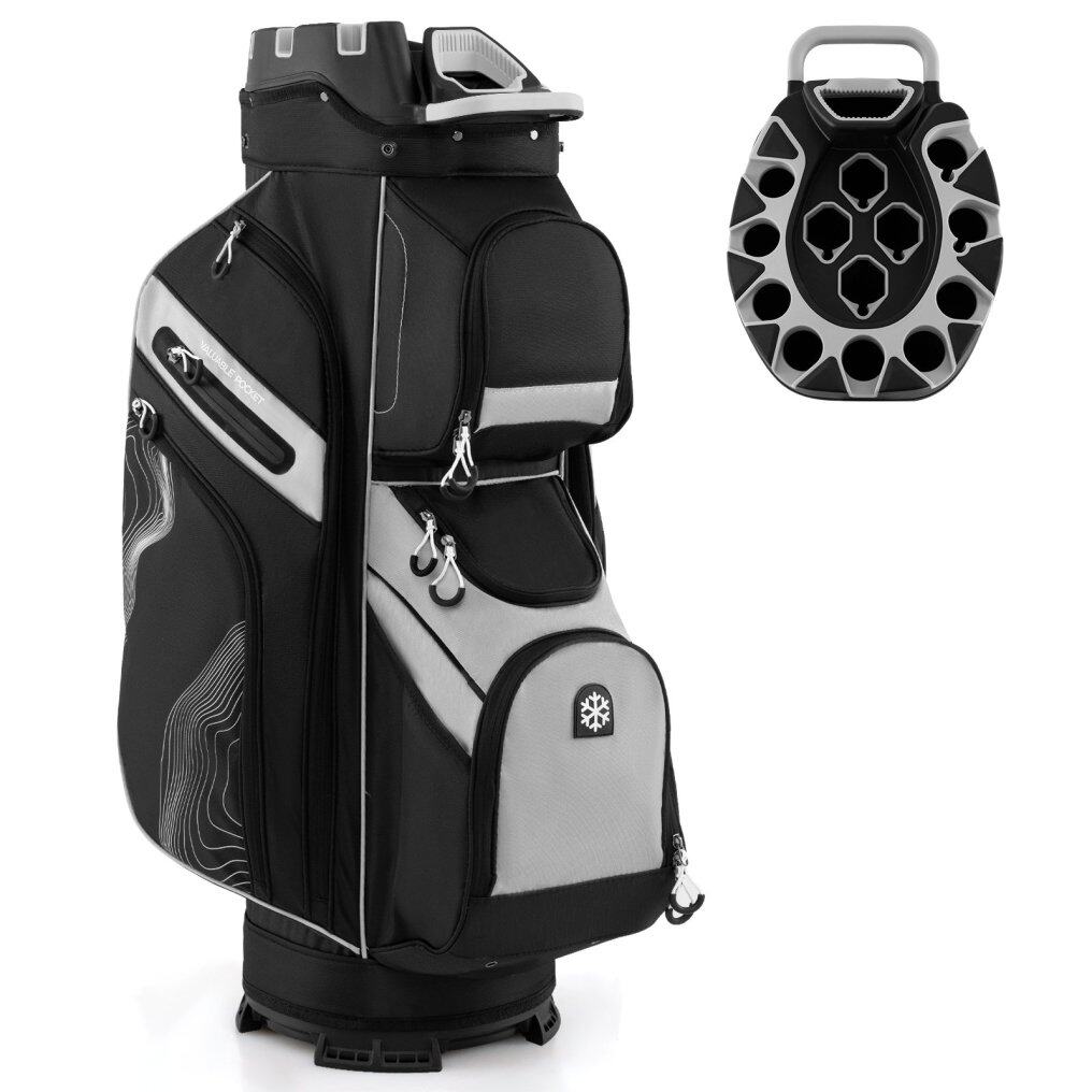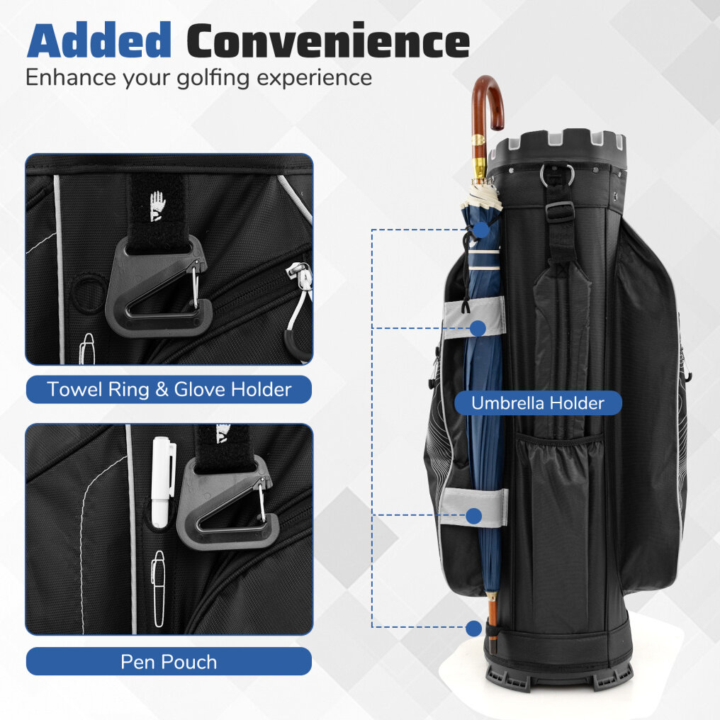 14-Way Divider Top: Featuring 14 full-length dividers with molded club locks, this golf cart bag ensures each club is securely held in place as well as prevents rattling and collisions. Please note that golf clubs are not included.