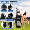 Designed with a 14-way molded lock top with full-length dividers, this golf bag offers excellent organization and separation of your clubs, ensuring they are securely held and easy to access. It features a total of 11 pockets, providing ample space for all your essential accessories. These include 2 lined valuables pockets to keep personal items safe and a cooler bag to keep your beverages chilled throughout the day. Crafted to cater to every golfer's needs, this golf club bag is lightweight and comes with a padded strap and multiple handles, making it effortless to carry around the golf course. Additionally, the golf bag includes a towel ring, glove holder, pen pouch, rain hood and umbrella holder for convenient use.