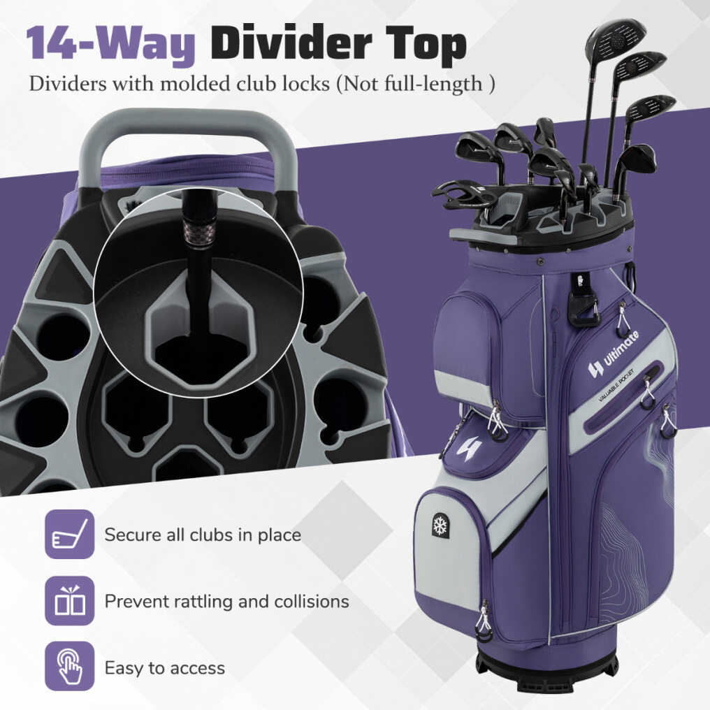 14-Way Divider: Featuring 14 full-length dividers and molded club locks, this golf cart bag ensures every club is securely held, preventing rattles and collisions. Please note that golf clubs are not included.