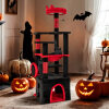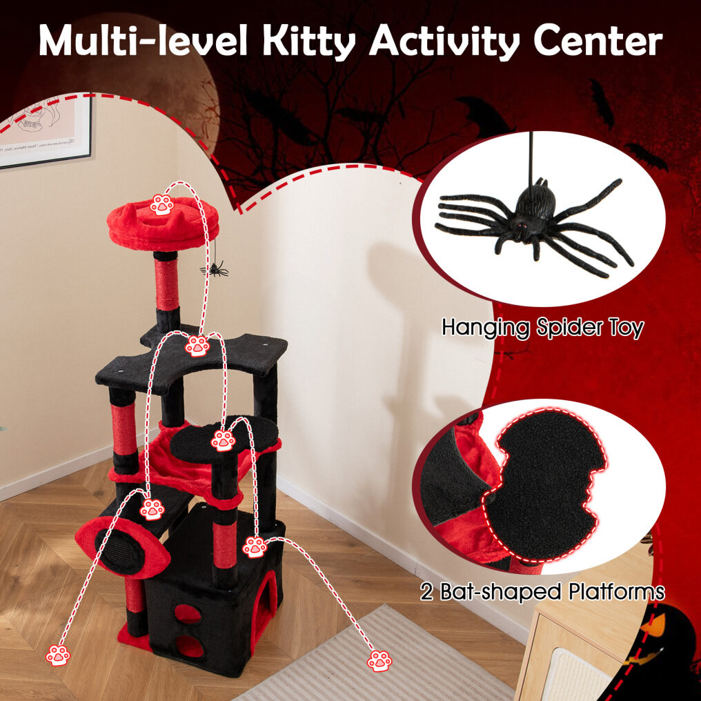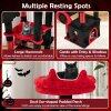 Enigmatic Gothic Theme: The black fabric combined with the plush red cushions offer a visual contrast that’s striking. Additionally, the quirky elements such as spider toy, bat-shaped platforms, devil’s eye-shaped sisal board, devil’s ear-shaped perch add to the tower's spooky theme.