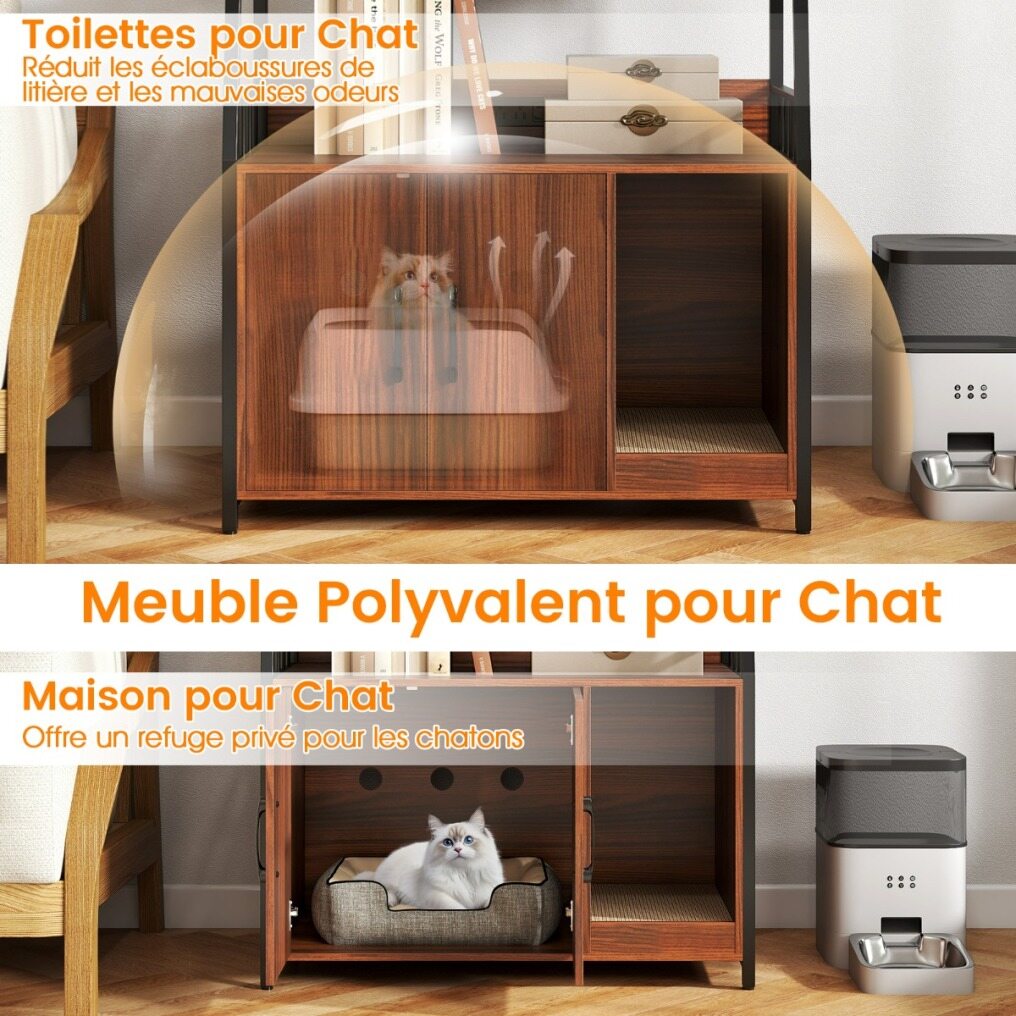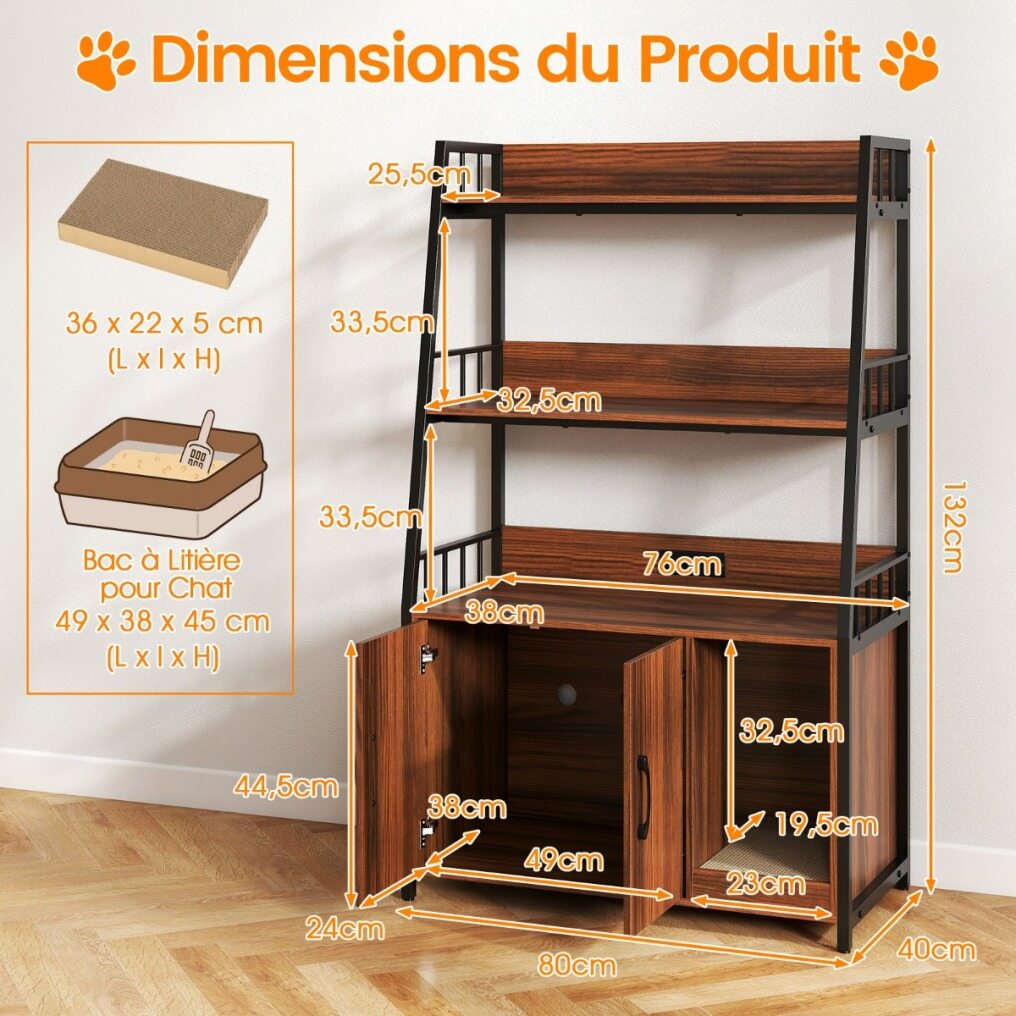 Step into the realm of this spacious enclosed cabinet, divided into two compartments. On the left, a double-door litter box sanctuary awaits, designed with air vents to limit litter scatter and unwanted odors. Meanwhile, the right side beckons with a designated scratching post, which caters to cat's instincts and preserves your furniture. The winding entrance elegantly guides curious cats into this world of wonder with two separate domains. Enhanced with three-tiered storage, this concealed cat toilet goes beyond mere calm, providing a sanctuary for your beloved pets while efficiently storing all their essentials in a tidy manner. Additionally, a charging station is ready for your feline companion's electronic gadgets.