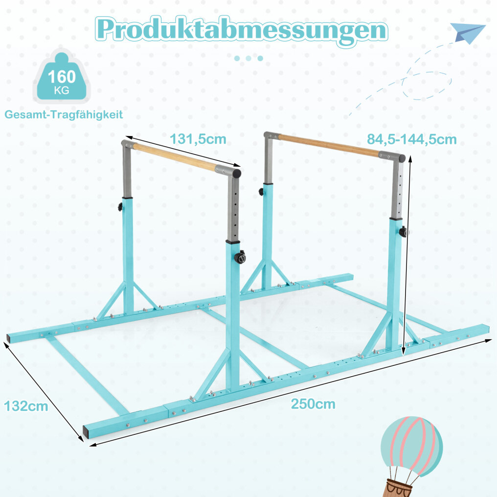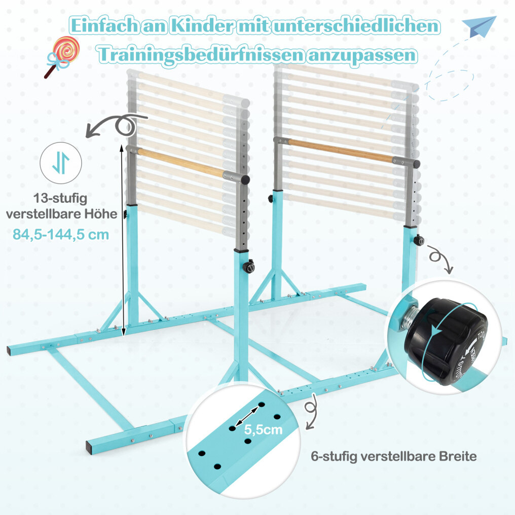 Adjustable Height & Width: With 13 adjustable height levels (84.5-144.5 cm) and 6 width options, these parallel bars easily adapt to children of different heights and training needs. Furthermore, the simple conversion allows for flexible switching between single and double bars as required.