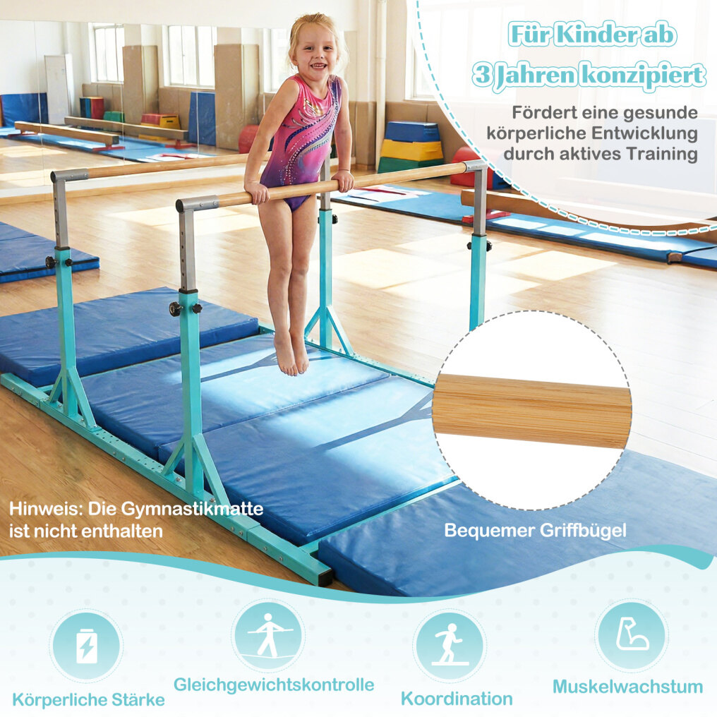 Multifunctional gymnastic bars: Suitable for children aged 3 and up, they support the development of upper body strength, balance control, coordination, and muscle growth. The comfortable grips ensure a pleasant training experience.