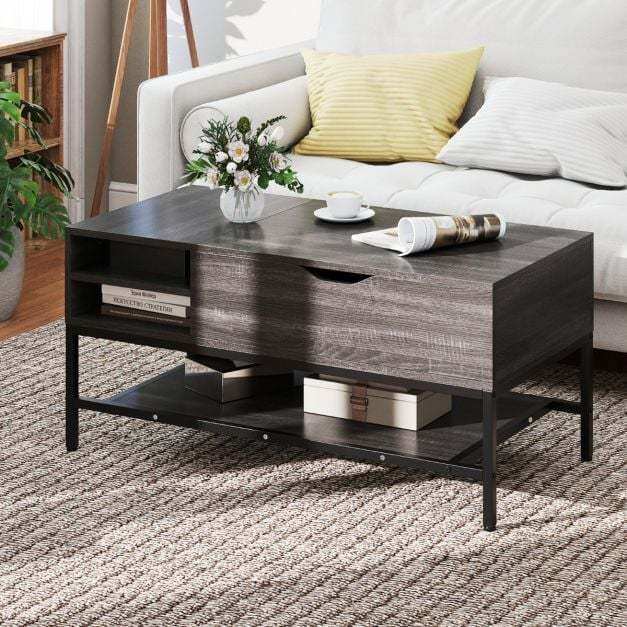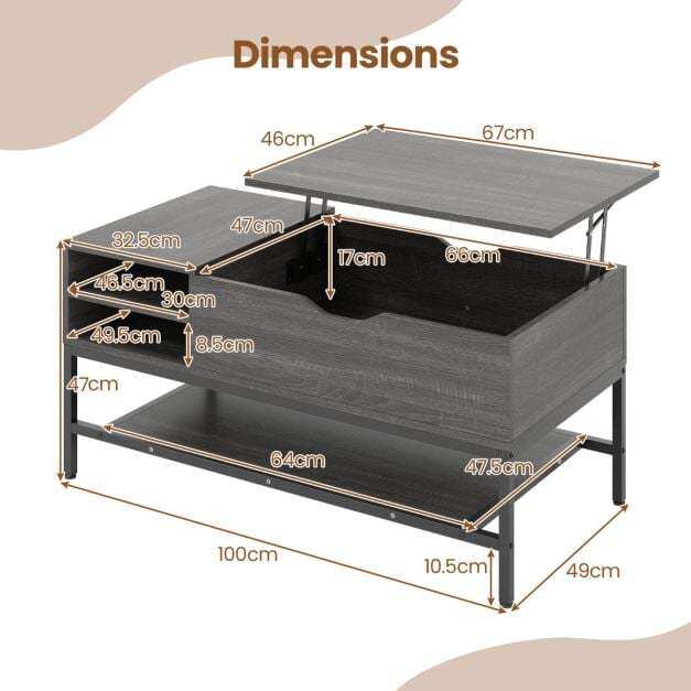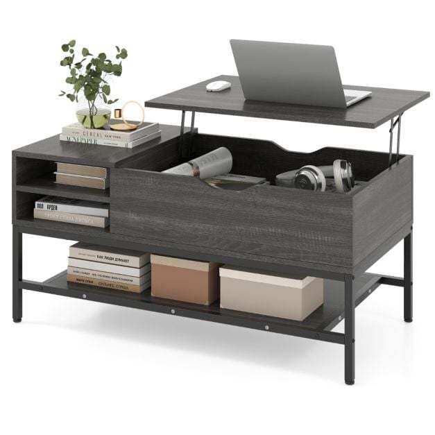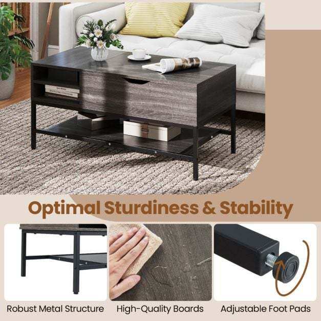 This versatile lift-top coffee table enhances your living space with its smooth and robust mechanism, offering effortless height adjustment secured by pinch-proof handles. Designed for optimal organization, it features a concealed compartment for valuables, a two-tiered side shelf ideal for magazines and snacks, and a lower shelf perfect for drinks or books. Constructed with a metal frame and sturdy panels, it ensures excellent stability, further enhanced by adjustable feet that compensate for uneven floors. Whether used as a stylish centerpiece, a laptop workstation, or an occasional dining table, this modern piece combines functionality and style.