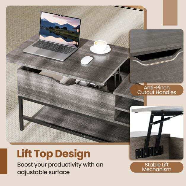 【Convenient Lift-Top】The lift-top coffee table features a smooth and stable lifting mechanism for effortless height adjustment. The anti-pinch cutout handles protect your hands, allowing for easy and safe opening and closing.