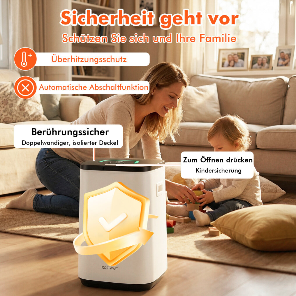 Safe, smart, and easy to move: Rest assured, this towel warmer is equipped with overheat protection, automatic shut-off, and a childproof lid – ideal for households with children. Two recessed handles and a convenient cable storage compartment on the bottom allow for easy carrying and storage without any hassle.