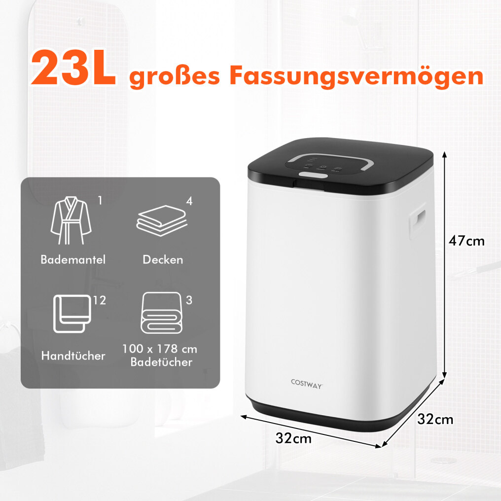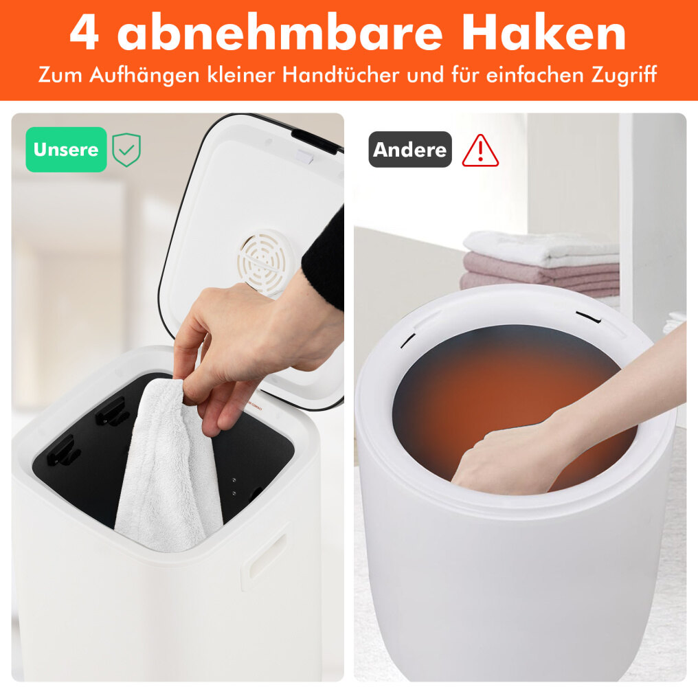 Large 23L storage capacity: The generous 23L capacity offers space for up to 3 oversized towels (101 x 178 cm), or blankets, bathrobes, and underwear. Four removable hooks allow for easy hanging of smaller towels; however, this heated bucket is only suitable for dry fabrics!