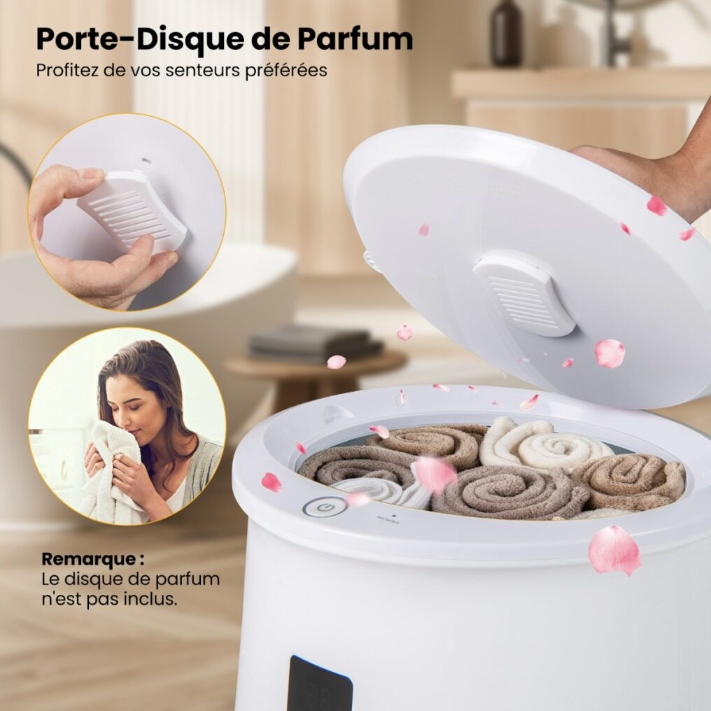 【User-Friendly Design】The bucket towel warmer features a scent disc holder so you can add your favorite fragrance and give your towels a soothing aroma. Note: The scent disc is not included. The removable lid with handle is easy to open, and the non-slip round base provides great stability.