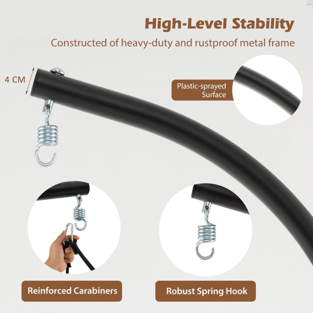 ● Heavy-Duty Metal Stand: The swing stand offers a perfect place to hang the swing chair. It's constructed of a heavy-duty and rustproof metal frame for high-level stability. And the reinforced carabiners and robust spring hook offer extra security.