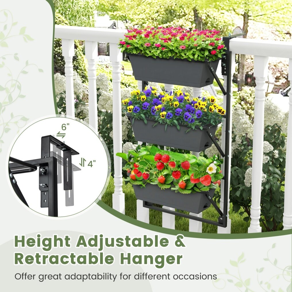 Versatile Hanging Options: Coming with 15 cm retractable and 10 cm height adjustable hangers, the vertical hanging planter can easily adapt to different railings on your window, balcony or garden fence. Alternatively, the planter can be directly fixed on the wall at your desired height using the expansion screws that are included.