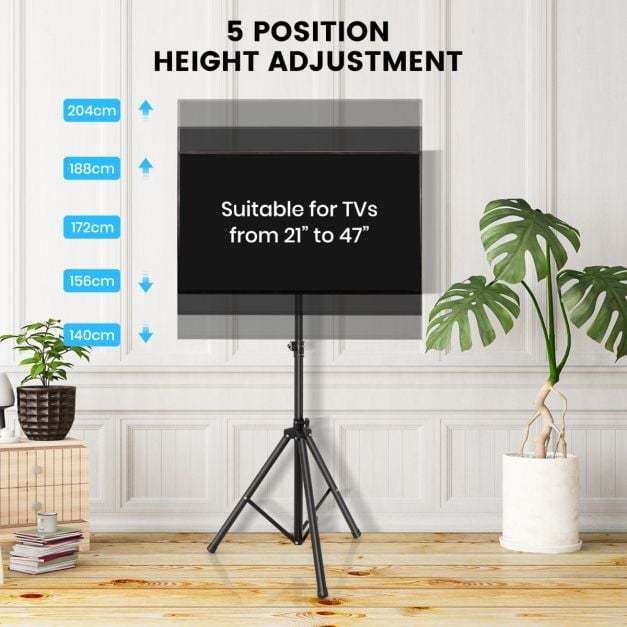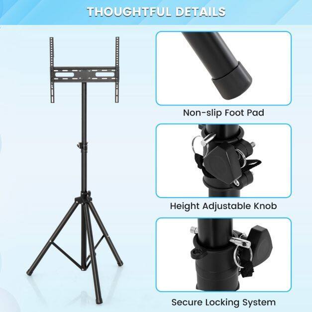 Height Adjustable TV Stand: Features 5 position height adjustment, this TV tripod allows you to conveniently adjust the height of your display stand to find the perfect viewing position. Additionally, the foot adjustable knob can be applied according to the ground condition.