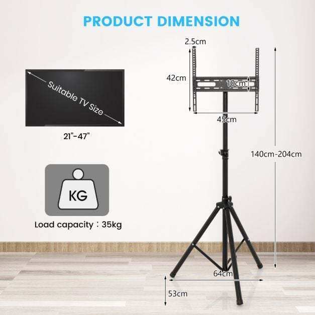 Stable and Durable Design: Crafted from premium metal tube with plastic coated finish, this display stand is designed to provide a long service life. In addition, the steady triangular support structure can hold up to 35 kg of weight, which is suitable for various TV size from 21" to 47".