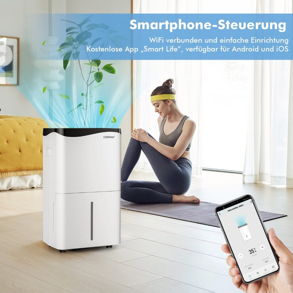 Our highly efficient dehumidifier will impress you. With a dehumidification capacity of 50L/day, this humidifier is capable of providing dry and comfortable air in large spaces. This humidifier has 4 modes (automatic dehumidification, continuous drying, sleep and ventilation) and 2 fan speeds for you to choose. Besides, this device is equipped with a 24-hour timer. The device can be dehumidified manually and continuously. More importantly, the overflow protection will automatically shut off the device when the water tank is full. Except the touch control panel, you can also control the device with the free “Smart Life” app available for Android and iOS. And regular maintenance is easy with the removable and washable air filter