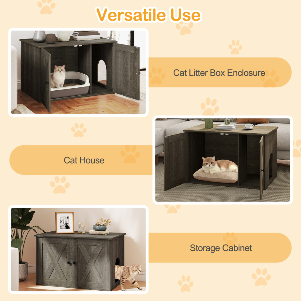 ● Versatile Use: Designed to be much more than a cat litter box enclosure, this 31.5" x 21" x 20" wooden cabinet transforms effortlessly into a cozy cat house or a chic storage cabinet, perfect for organizing pet essentials, magazines, or decorations in any room.