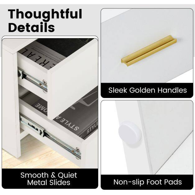 Thoughtful Details: With sleek golden handles and premium metal slides, the drawers of this end table can be easily and quietly pulled out. Besides, the dresser is also fitted with non-slip foot pads for enhanced stability.
