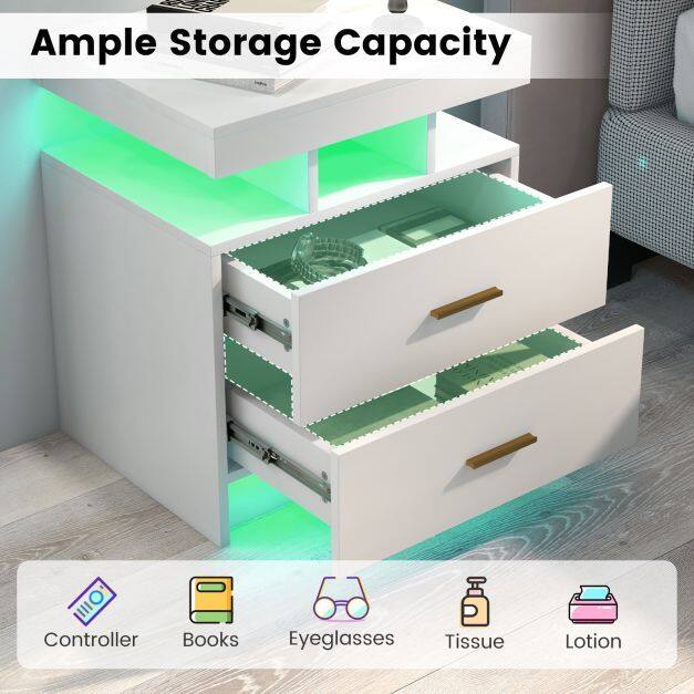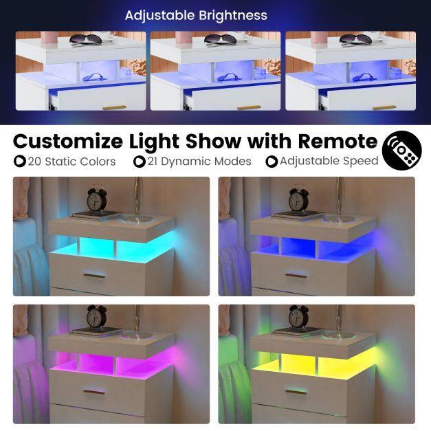 Illuminate Your Bedroom: The LED nightstand features built-in LED lights that create a soft and ambient glow, making it a stunning addition to your bedroom. It looks even gorgeous with multiple color options and creative dynamic modes.