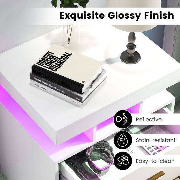Exquisite Glossy Finish: The lighted nightstand showcases a reflective high-gloss finish that adds a touch of sophistication and style to your bedroom. Meanwhile, the surface is smooth and stain-resistant, saving time on daily maintenance.