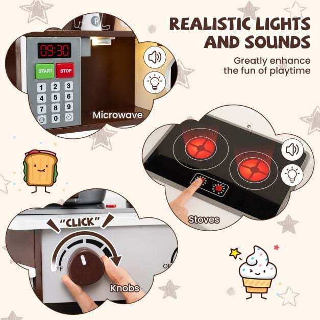 Fun Lights and Sounds: Both the microwave and stoves of this toy kitchen set are designed with realistic lights and sounds, which greatly enhance the fun of playtime(requires 4*AAA 1.5V Battery(not included)). Meanwhile, all of the knobs are rotary and make “click” sounds to offer children a real cooking experience.