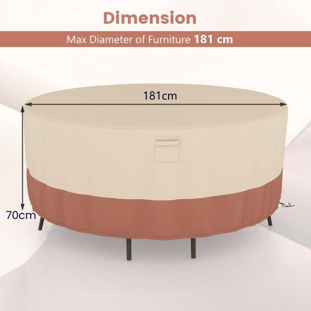 Flexible Fit for More Sizes: Sized at 158 x 70/181 x 70/213 x 70 cm (D x H), the patio furniture cover can match most round table chair set with a max diameter of 158/181/213 cm. But the coverage depends on the furniture dimension, especially the chair depth. Please measure the size of your furniture before purchasing.