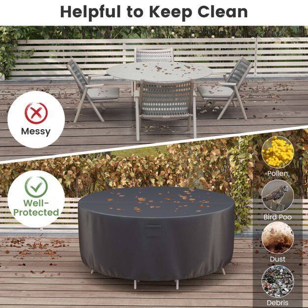 All-Weather Protection: The round table chair set cover aims to offer all-year-round protection against various debris. More, its PU coating promotes water resistance to keep your furniture well-protected from sun, wind, snow and rain.