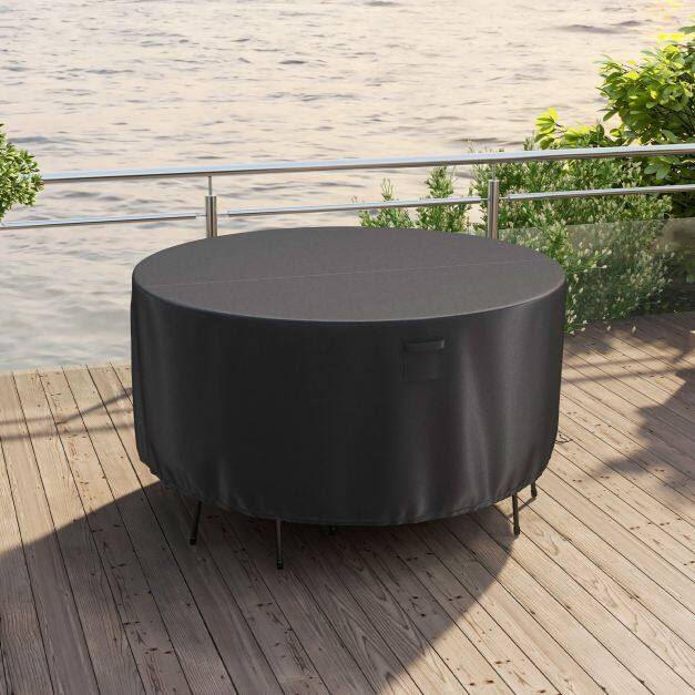 It is perfect for round table chair sets up to 158/181/213 cm in diameter. Crafted from PU-coated polyester fabric, this table chair set cover is not only durable and tear-proof, but also built to withstand the harshest outdoor elements. Come rain, snow, sun, or wind, this all-weather table cover offers all-year-round protection against nature’s debris. Its intelligent design includes air vents for excellent circulation, preventing the cover from being lifted by strong winds. With buckle straps and adjustable drawstrings, installation is a breeze, ensuring a secure fit that won’t be blown away. Now say bye to your messy patio furniture, the outdoor furniture cover will be helpful to keep clean. But the coverage depends on the furniture dimension, especially the chair depth. Please measure the size of your furniture before purchasing.