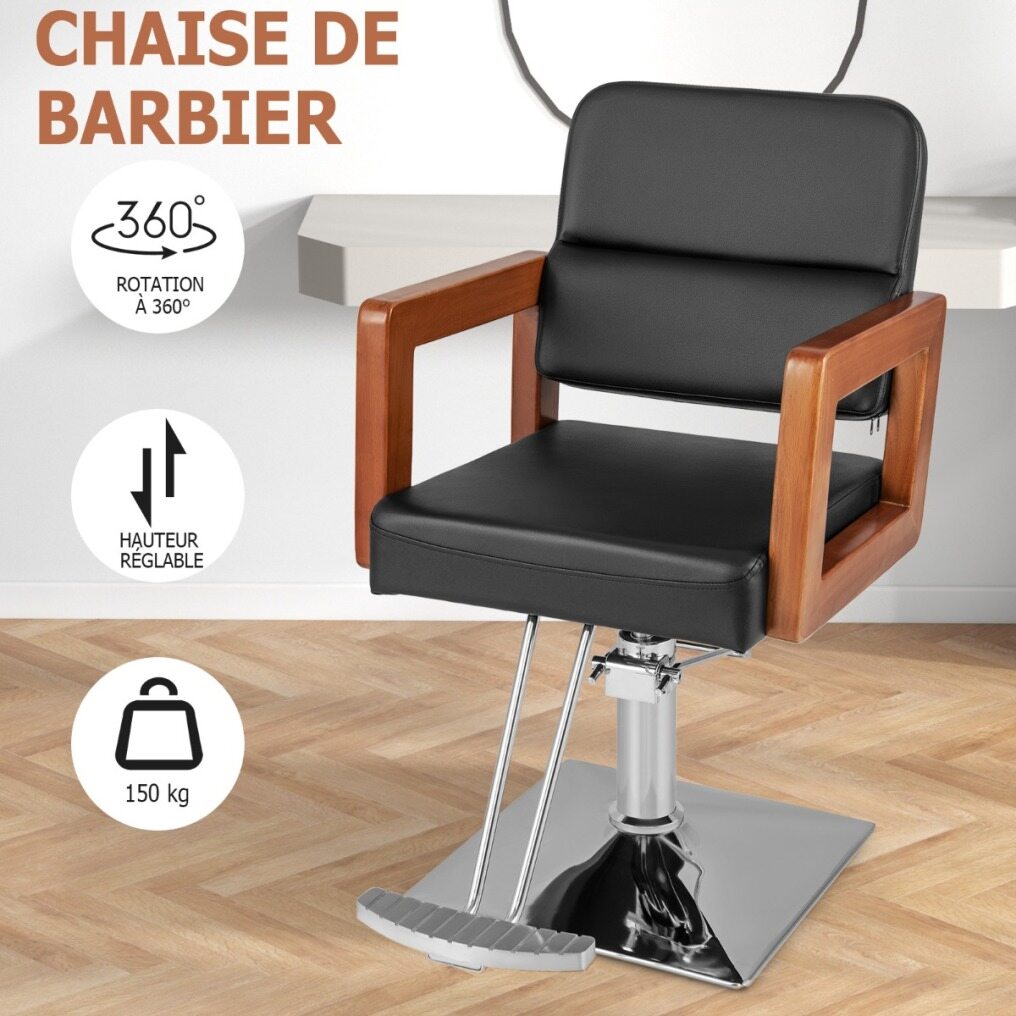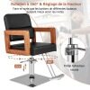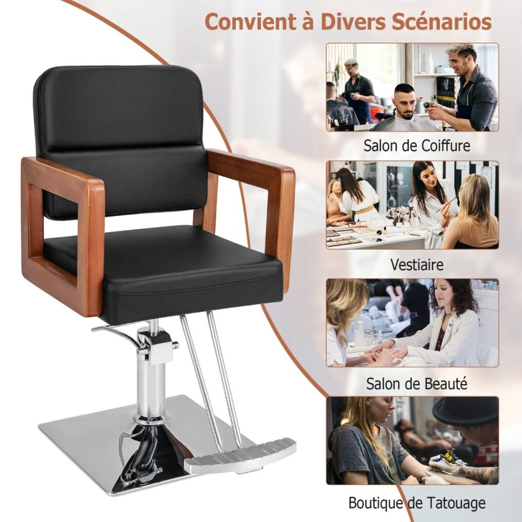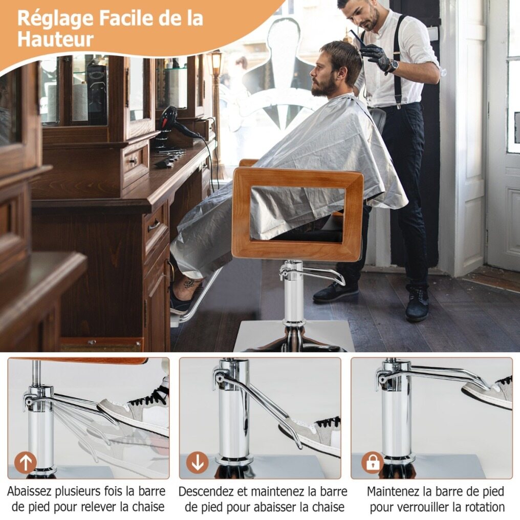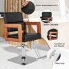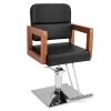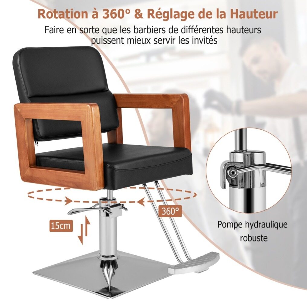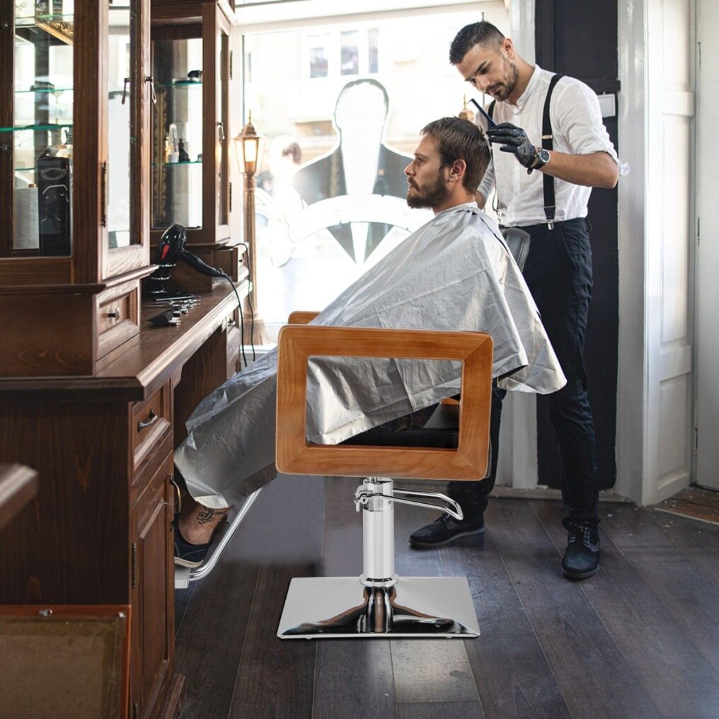 Looking for a versatile and stylish barber chair? The chair features a modern design with a black color scheme, glossy electroplating frame, and elegant wooden armrests, which provide you with comfortable sitting experience. The 360° rotation feature gives your customer the flexibility to move around effortlessly, and has 15cm adjustable height for you to find the idea working position, it also provides a super comfortable sitting experience with high density sponge cushion. Besides, made from high-quality materials, this salon chair is easy to clean and has a sturdy frame. Assembly is a breeze with straightforward instructions. Upgrade your salon or barber shop today!