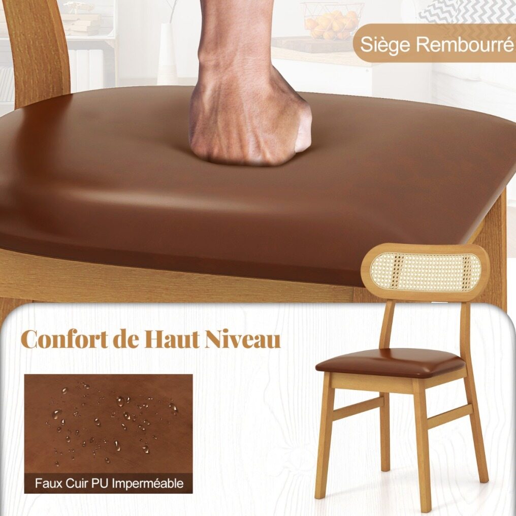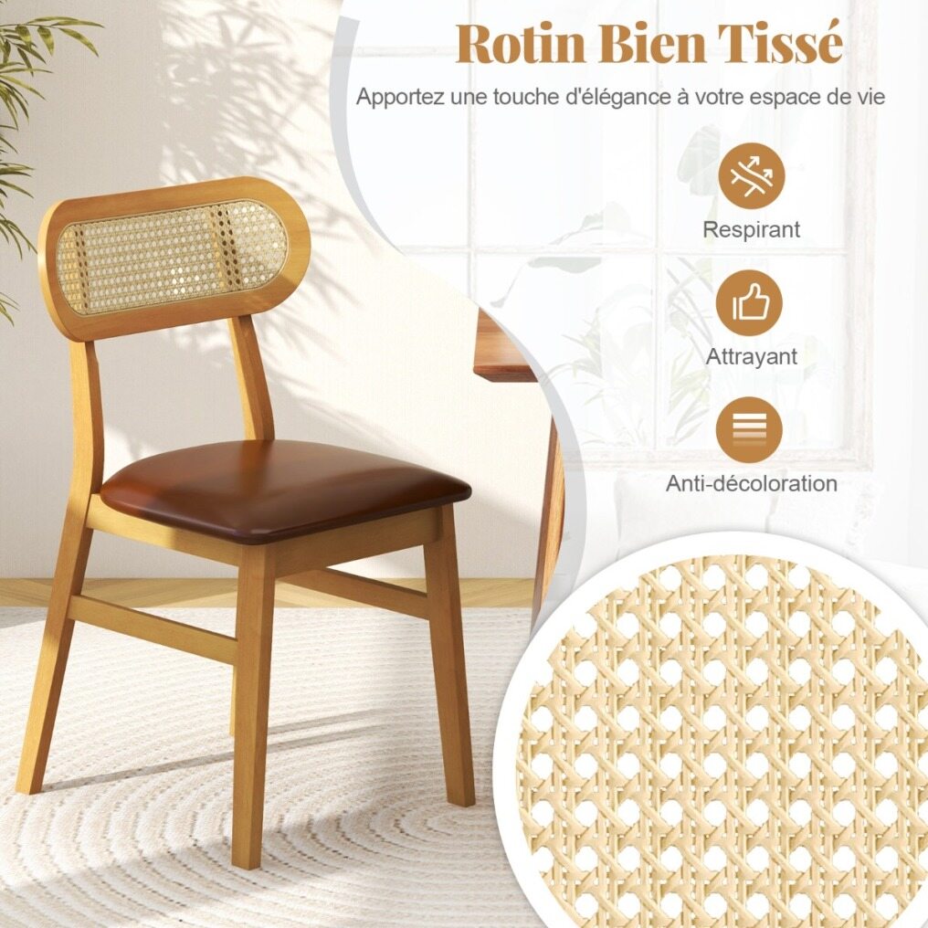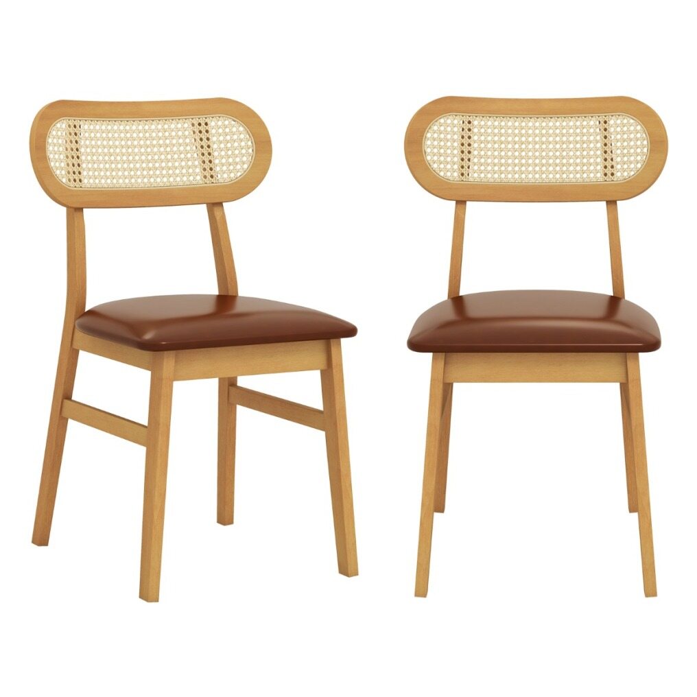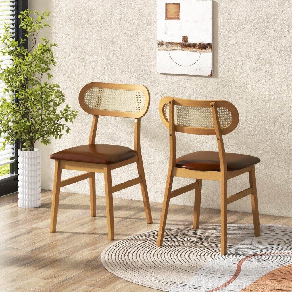 Each chair is crafted from premium rubberwood with reinforced cross brace that provides strong support and can withstand prolonged use. The padded seat with curved backrest offers endless comfort while the waterproof PU faux leather ensures luxurious comfort and easy cleaning. The well-woven rattan backrest enhances both support and aesthetics, adding a chic accent to your living space. These mid-century modern chairs embody minimalist elegance, making them an exquisite addition to any dining room, kitchen, or cafe. Upgrade your indoor dining experience with these chic and functional chairs.