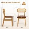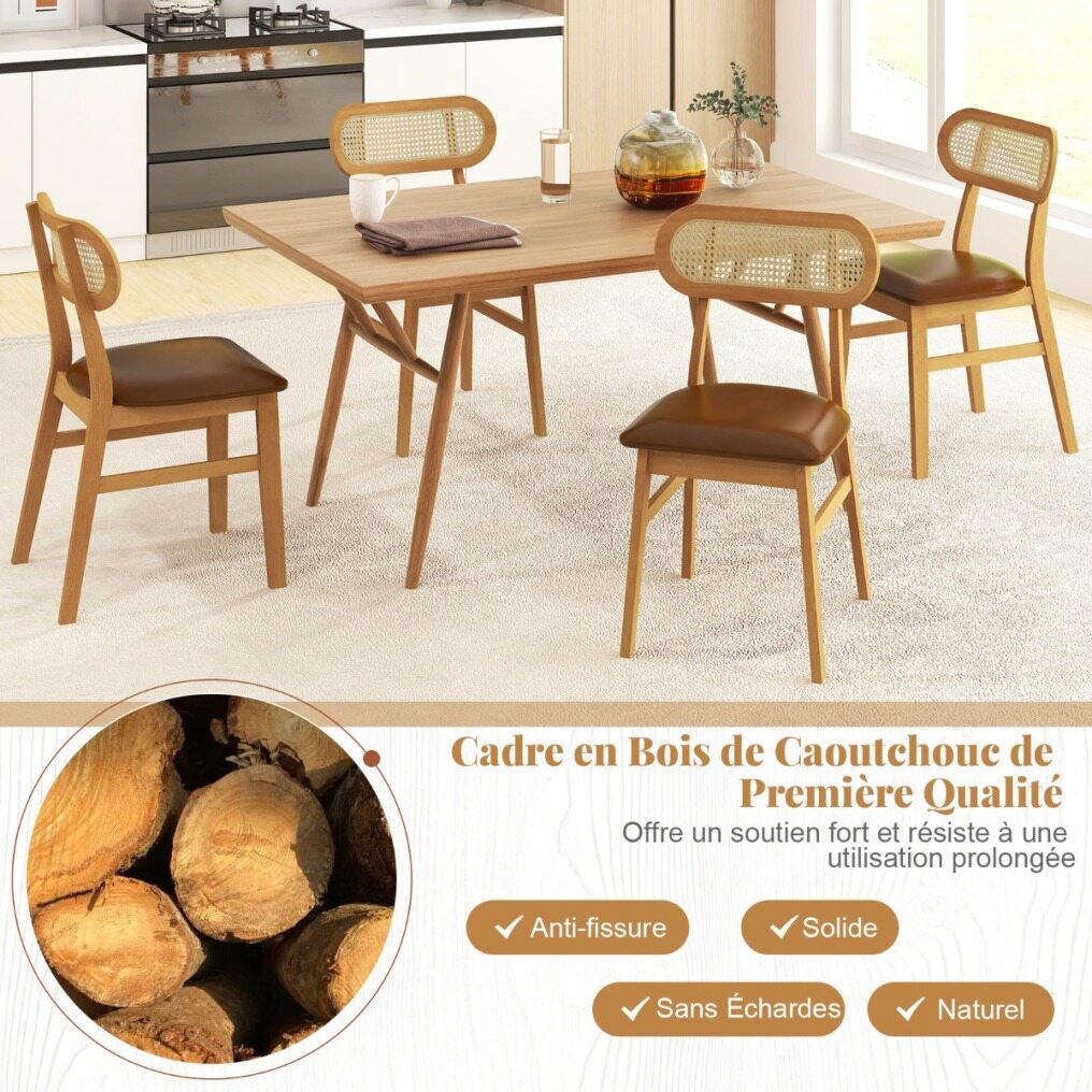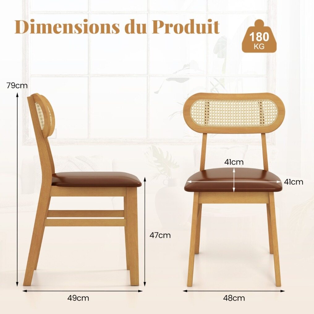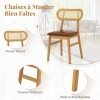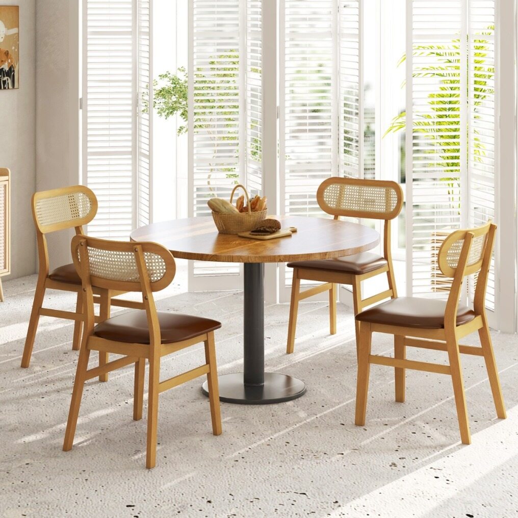 Each chair is crafted from premium rubberwood with reinforced cross brace that provides strong support and can withstand prolonged use. The padded seat with curved backrest offers endless comfort while the waterproof PU faux leather ensures luxurious comfort and easy cleaning. The well-woven rattan backrest enhances both support and aesthetics, adding a chic accent to your living space. These mid-century modern chairs embody minimalist elegance, making them an exquisite addition to any dining room, kitchen, or cafe. Upgrade your indoor dining experience with these chic and functional chairs.