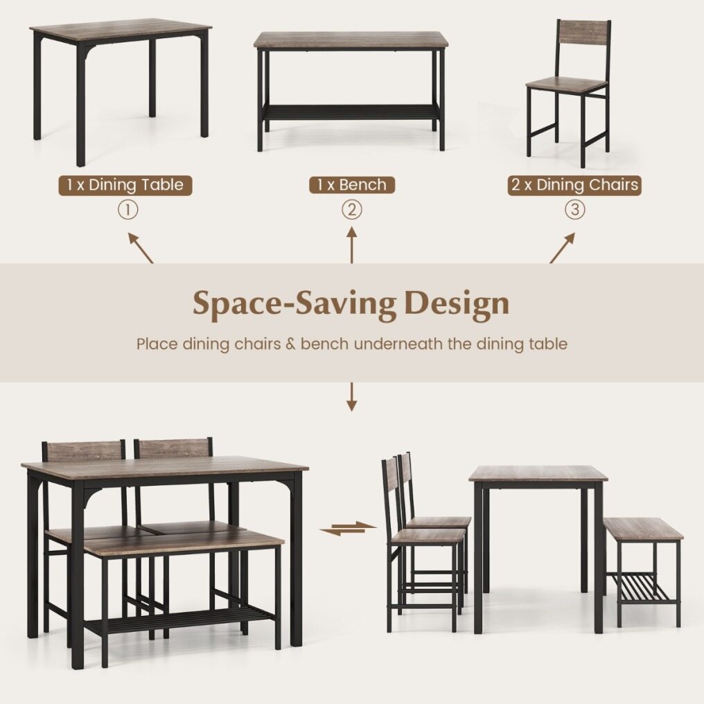 Space-Saving Design Improves Utilization: Two armless chairs and the bench can be tucked under the table without taking up space. Also, the extra rack under the bench, meeting the needs of sitting & storing. All in all, this table set is suitable for limited living space.