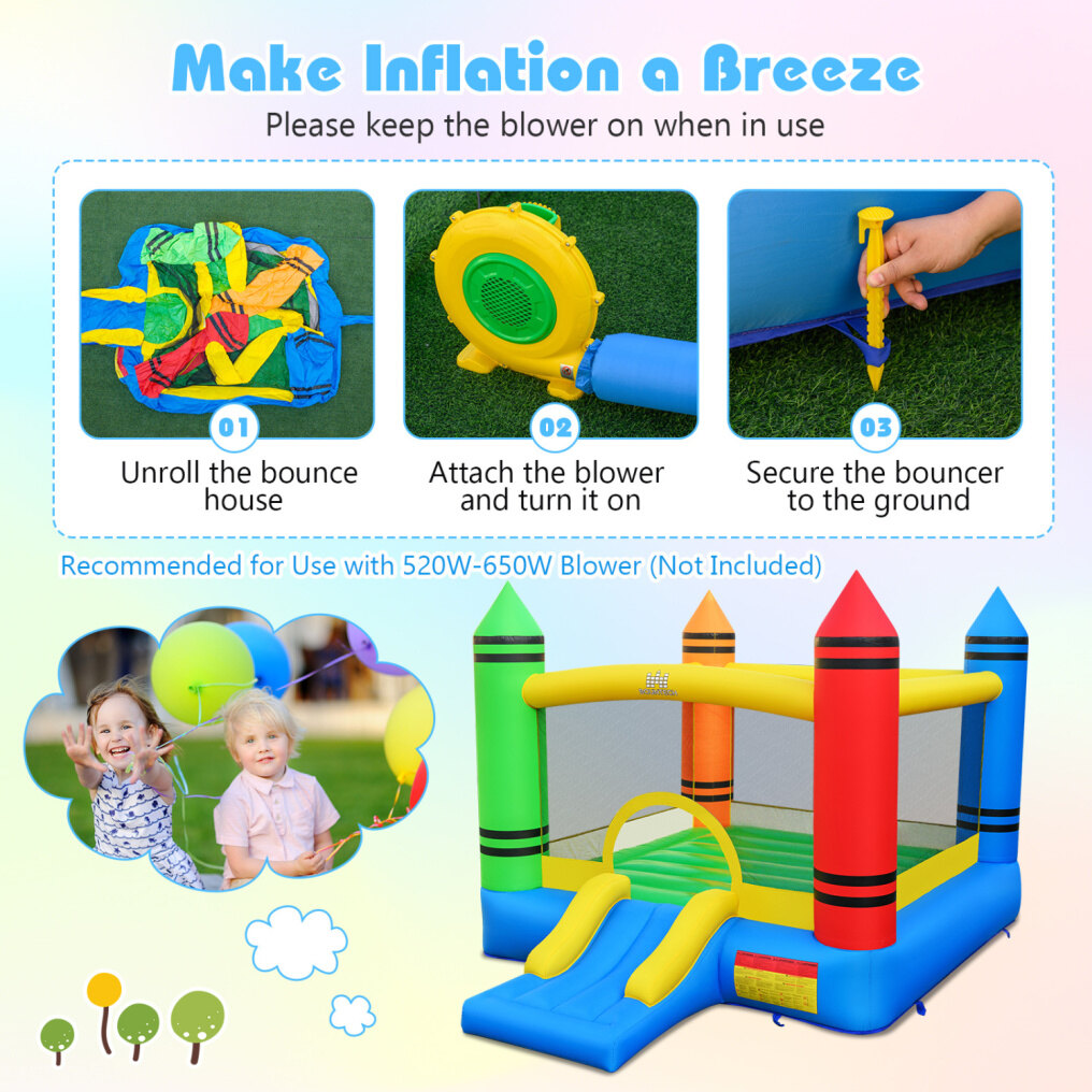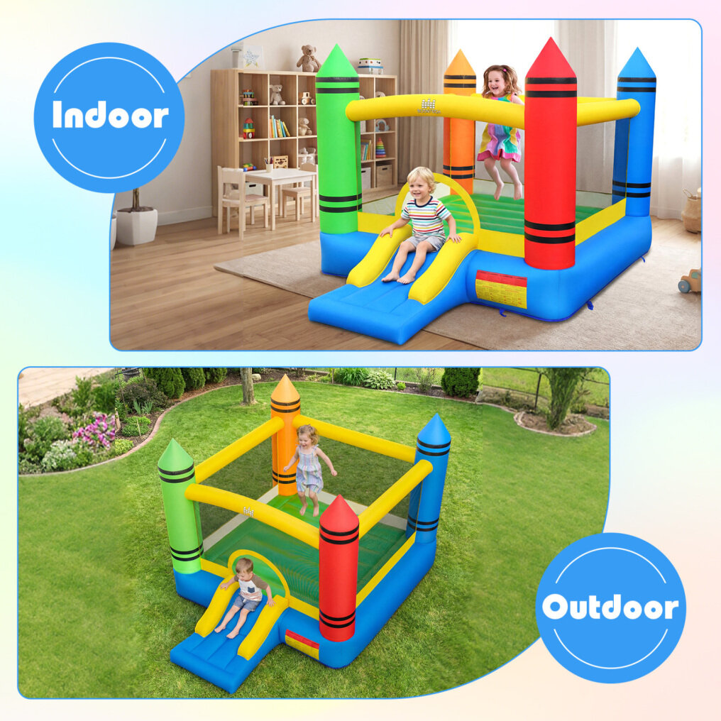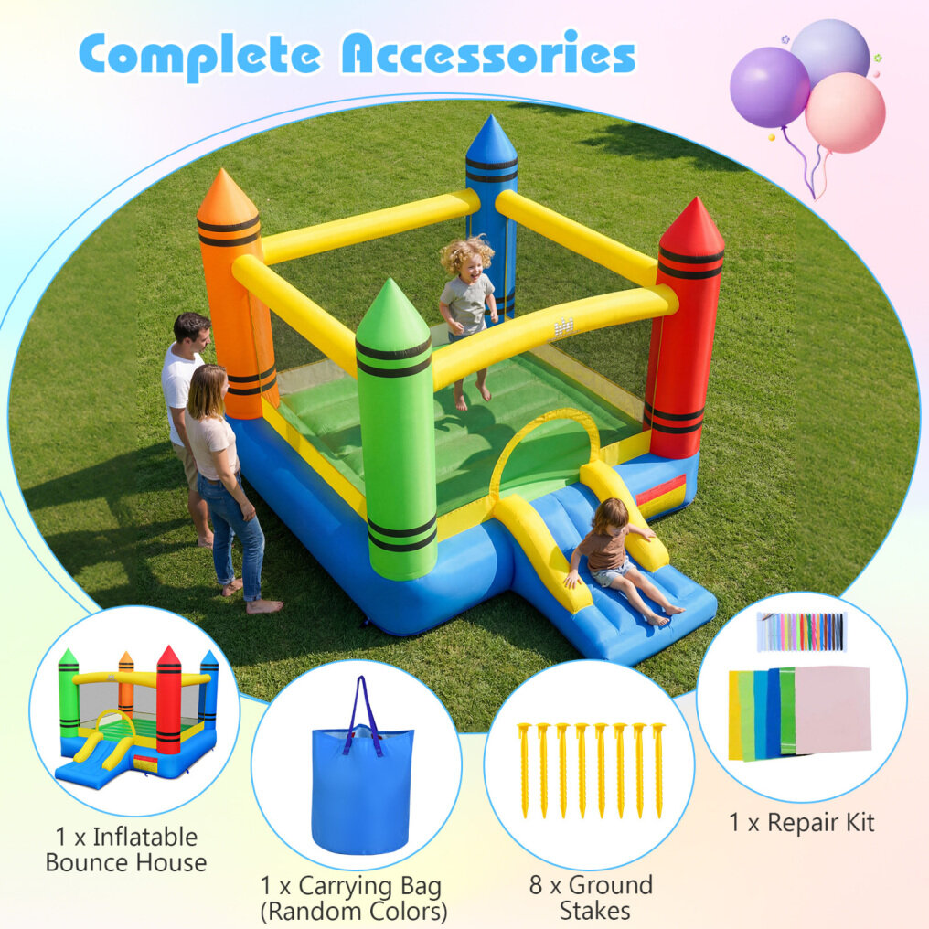 ● Dual-Activity Fun: Combining a roomy bouncing zone with an exciting slide, this crayon-themed inflatable bounce house provides endless entertainment for kids. Its versatile 2-in-1 design promotes energetic play and sparks creative imagination for hours of enjoyment.