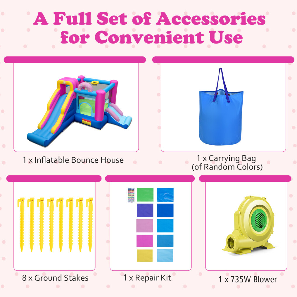 ● Fun-Filled Play Area: This inflatable bounce house delights kids with its vibrant doughnut-themed appearance. Equipped with a long slide, short slide, jumping area, climbing wall, and basketball hoop, the blow up bouncy castle offers multiple activities that keep children entertained and active for hours.