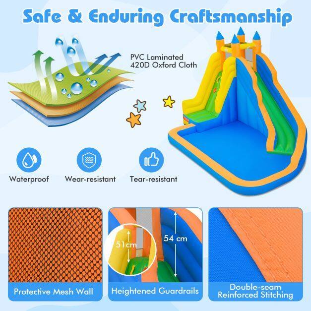 Built-in Protection Features: A dedicated waiting area with mesh walls helps keep kids visible while they play and prevents accidental falls or rough entry onto the slide. Heightened guardrails plus a buffer platform underneath the climbing wall add extra peace of mind, making this inflatable bounce house water slide a safer choice for families.