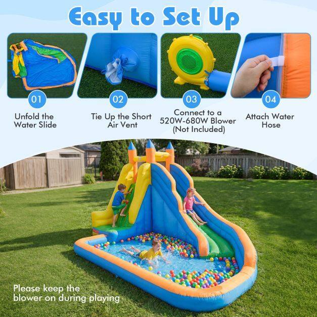 Full Kit for Easy Setup: Includes a carrying bag, repair kit, 8 ground stakes, and a water hose kit to help you secure, maintain, and enjoy your setup with less hassle. Unfold the water slide, tie up the short air vent and connect to a 520W-680W blower (not included) for fast, reliable setup of your inflatable water slide.