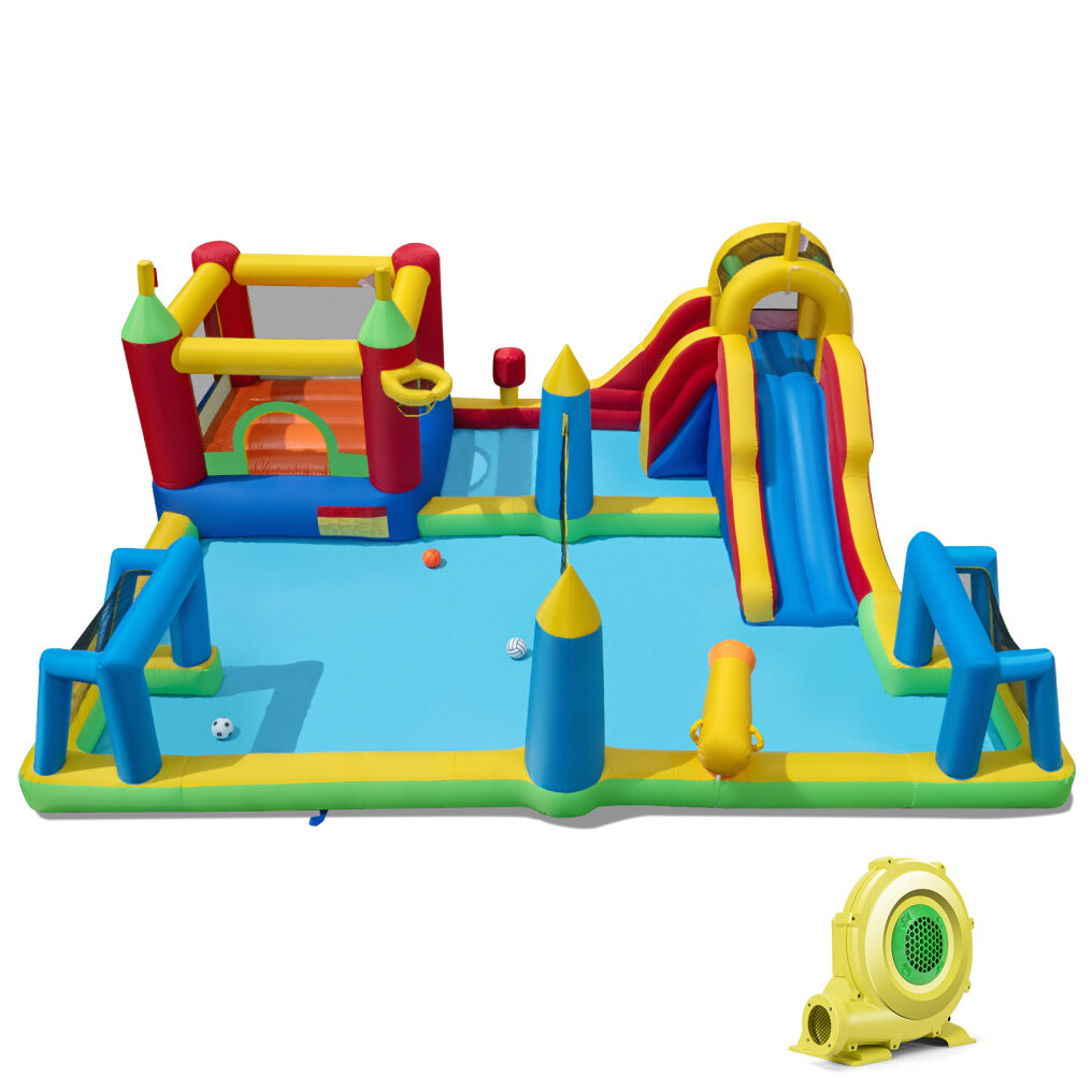 ● All-Season Aqua Playground: Turn your yard into a mini water park: a long water slide, a roomy jumping area, a climbing wall with grab handles, a punching bag, a shallow splash pool with water cannon, plus 3 games (basketball/football/volleyball). Available in both wet and dry, kids stay busy from spring to fall.