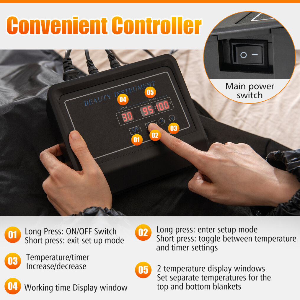 ● Advanced Infrared Heating Technology: This infrared sauna blanket could penetrate deeply into the skin, effectively heating to release sweat. Revitalize your skin, burn calories, reduce stress, improve sleeping, all while enjoying a spa-like experience in the comfort of your home.