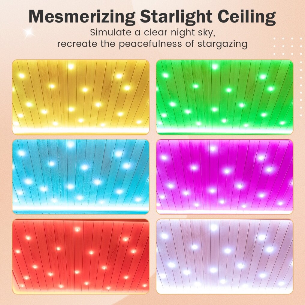● Advanced Light Therapy and Starry Sky Ambiance: This infrared sauna room features RGB chromotherapy lighting, which offers 7 static colors and 2 soothing dynamic lighting modes, creating a tranquil ambiance. Moreover, it adopts a mesmerizing starlight ceiling that mimics a serene night sky, enhancing relaxation.