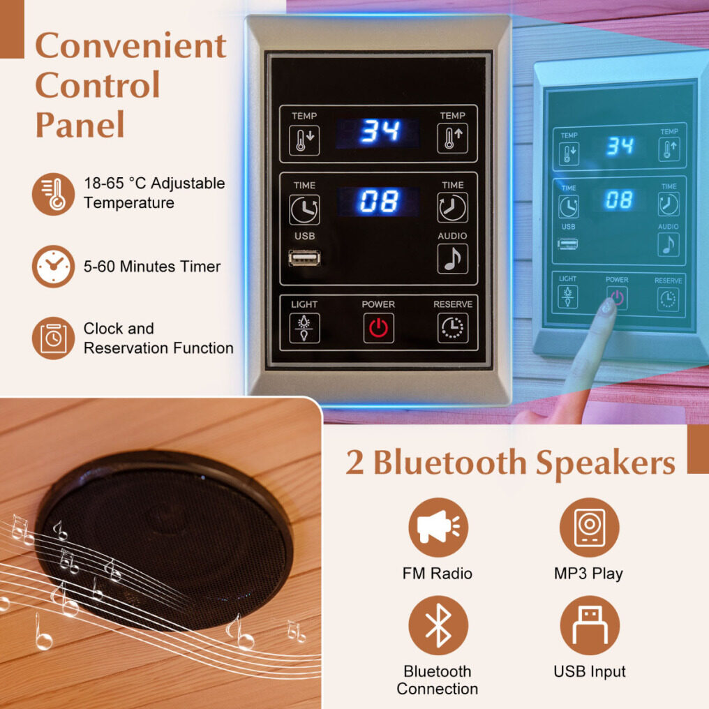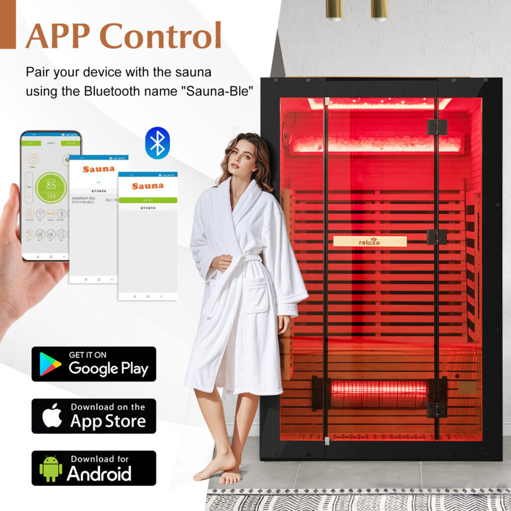 Convenient Control Panel and APP Control: Stay in control with the user-friendly control panel, enabling you to set temperatures from 18-65 °C and timer from 5-60 minutes. Furthermore, for seamless control, the sauna can be paired with the “Infrared Sauna” app via “Sauna-Ble” Bluetooth for effortless adjustment.