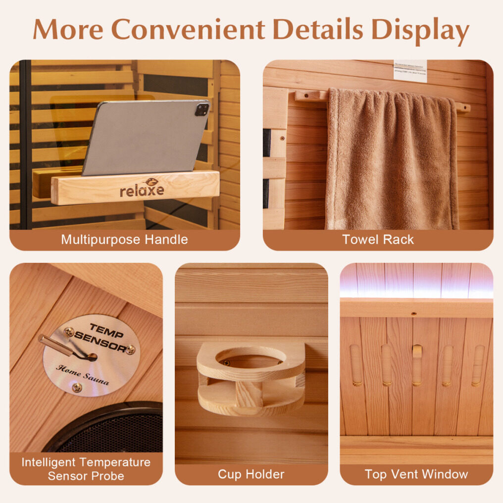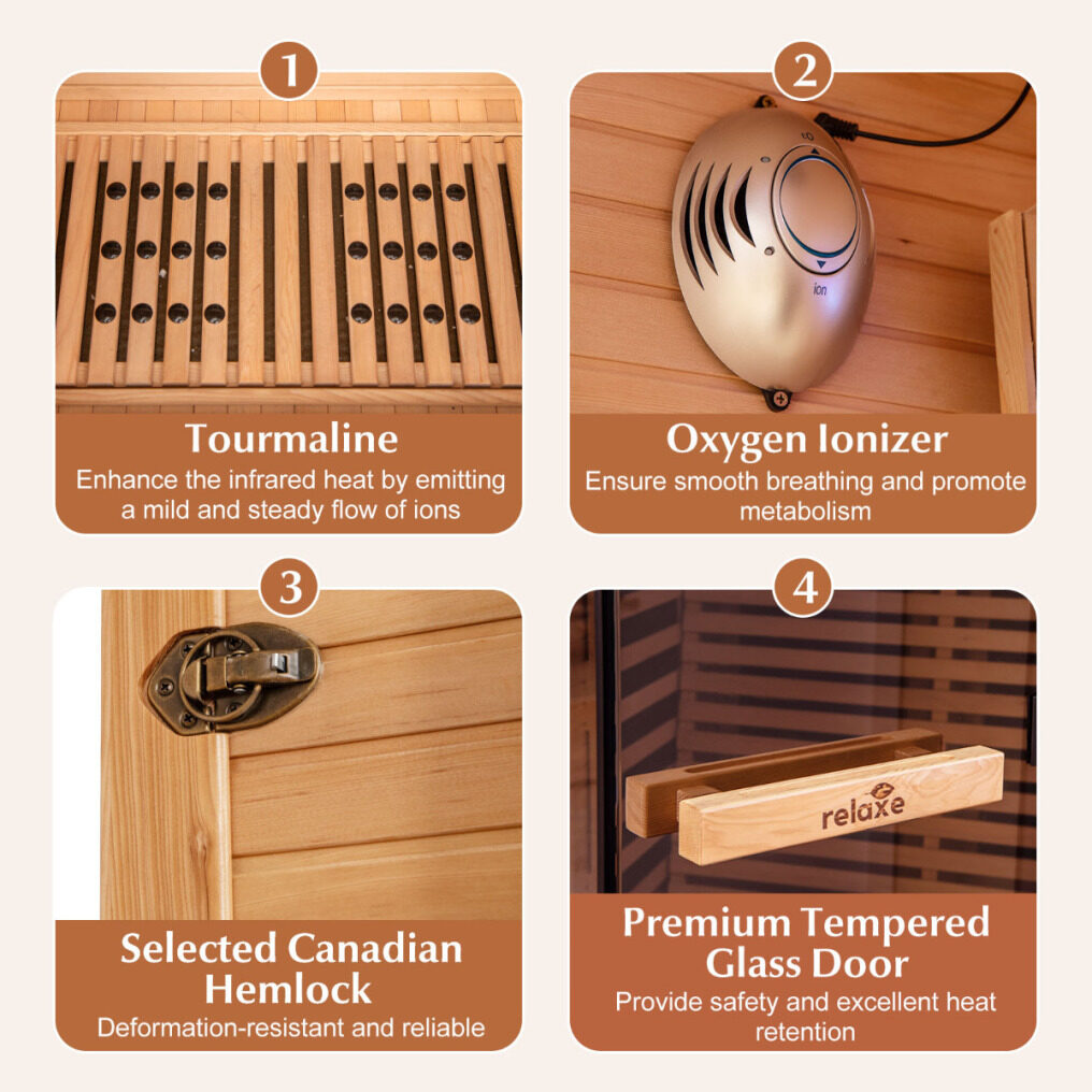 Premium Materials and Construction: The sauna room is expertly crafted from selected Canadian Hemlock wood, which is known for its durability, resistance to warping, and beautiful natural aroma. The premium tempered glass door adds a touch of elegance while ensuring safety and heat insulation, creating a comfortable and inviting environment for your at-home sauna experience.