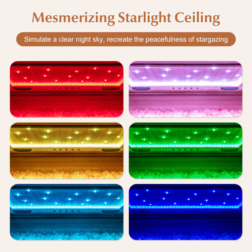 Advanced Light Therapy and Starry Sky Ambiance: This infrared sauna room features RGB chromotherapy lighting, which offers 7 static colors and 2 soothing dynamic lighting modes, creating a tranquil ambiance. Moreover, it adopts a mesmerizing starlight ceiling that mimics a serene night sky, enhancing relaxation.