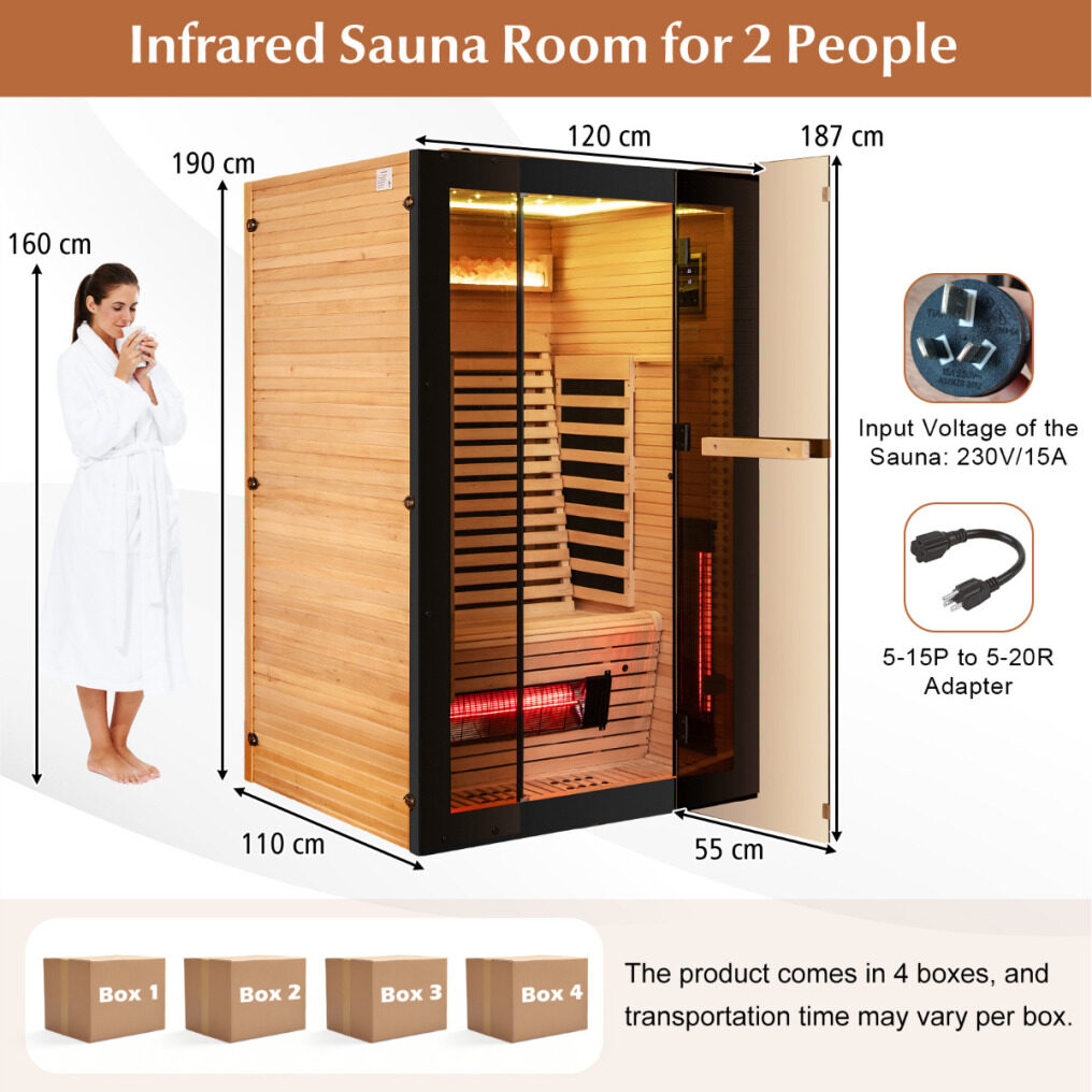 Large Space: Measuring 120 x 110 x 190 cm (L x W x H), this infrared sauna room is spacious enough and could accommodate 2 persons comfortably. It requires 230V plug-in, and there is a 5-15P to 5-20R adapter, please check your home voltage before plugging it in. Besides, the product comes in 4 boxes, and transportation time may vary per box.