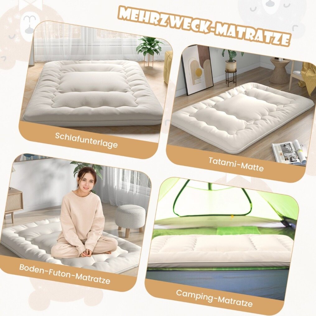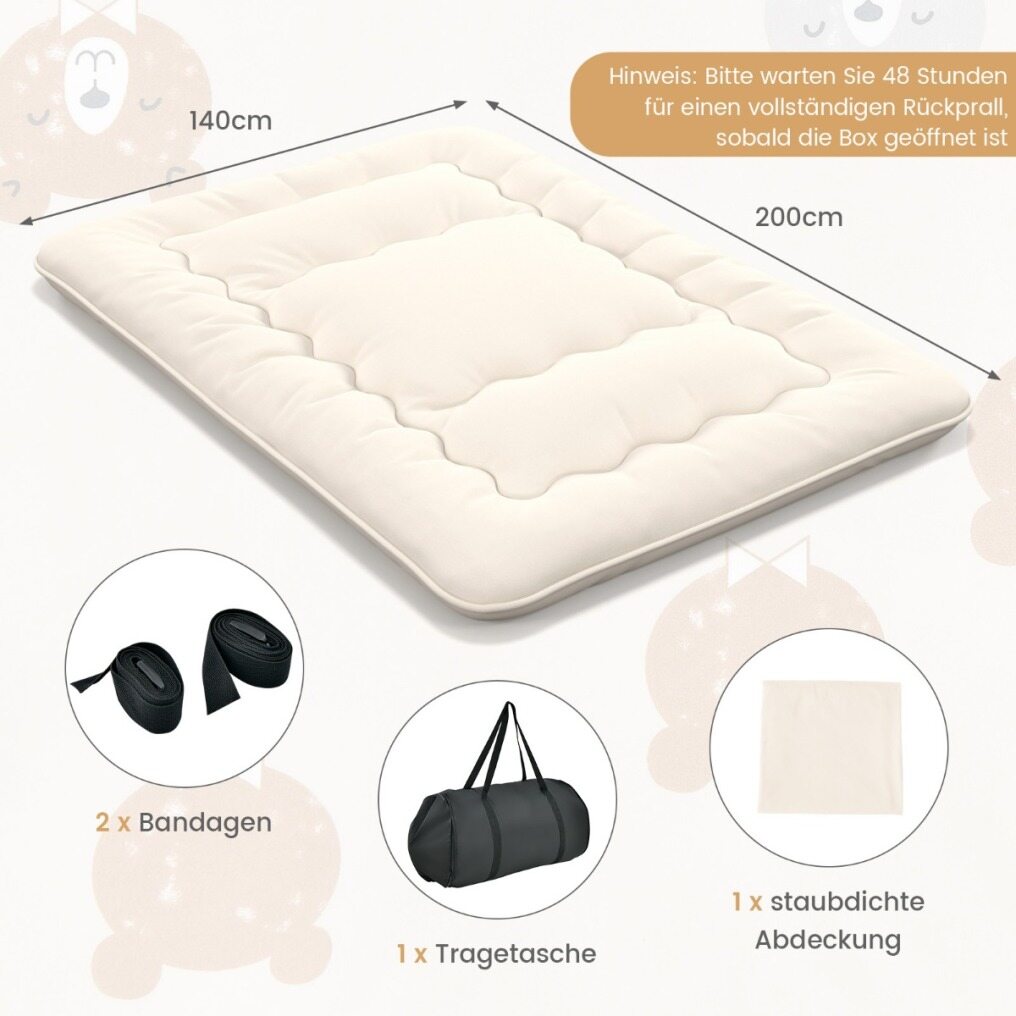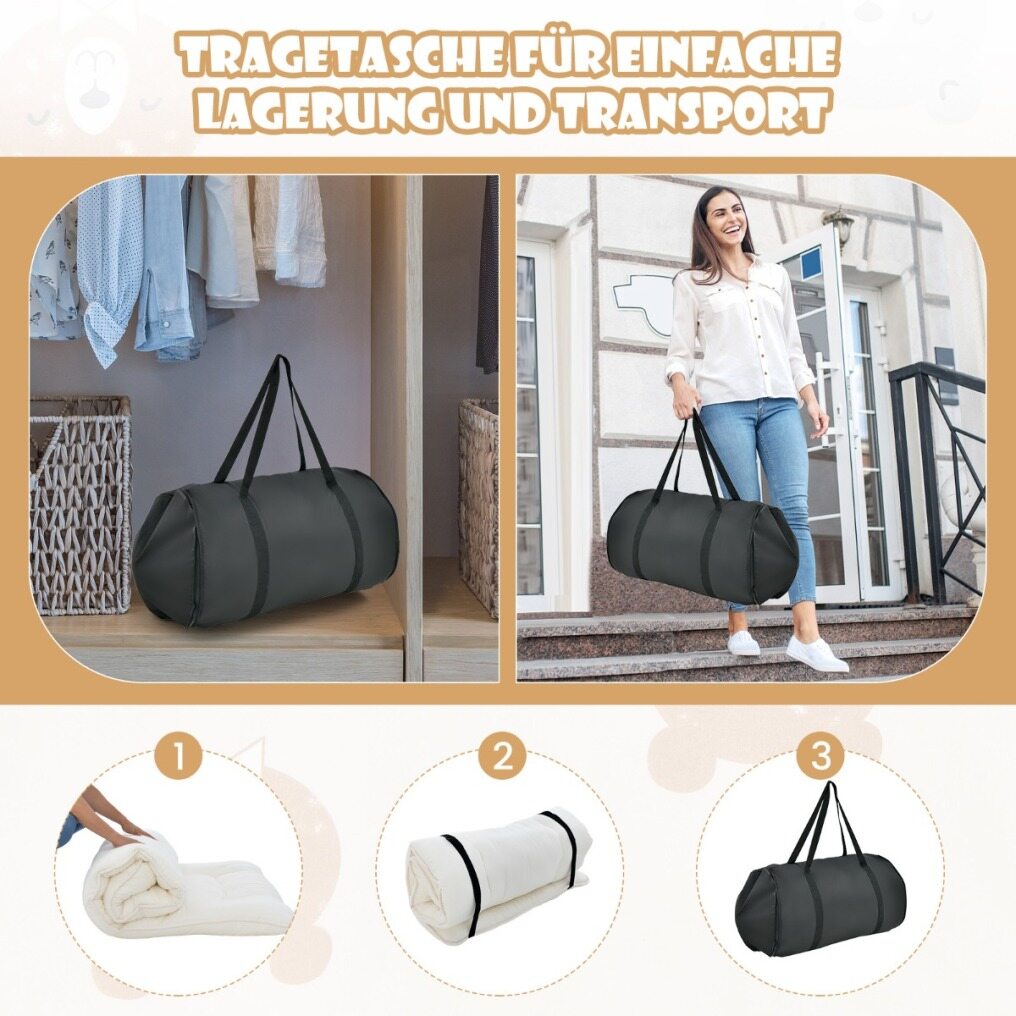This multifunctional mattress will surely improve your quality of life. This mattress can not only serve as a floor futon mattress, but also as a tatami mat, children's play mat, sleeping pad or camping mattress. The high-density polyester filling and soft microfiber fabric cover are the key to your maximum comfort and relaxation. In addition, the outer mattress cover with smooth zipper can be removed for easy washing. When not in use, the futon mattress can be rolled up, secured with bandages and stored in the carrying bag.