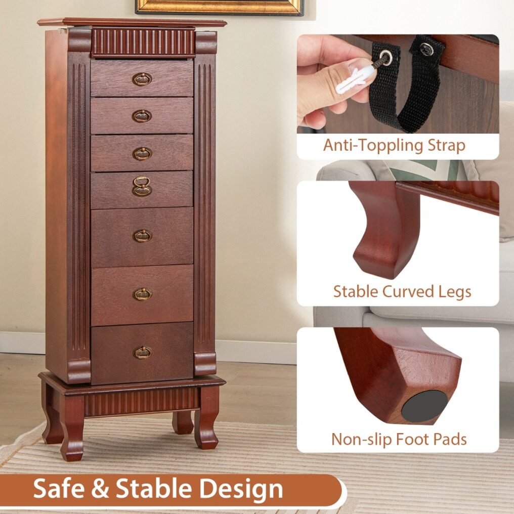 The jewelry cabinet features a flip-top mirror, allowing you to effortlessly try on your jewelry and make sure you look your best before stepping out. Underneath the mirror, there are 4 compartments to keep your bracelets, rings, earrings, and other small accessories organized and easy to find. The jewelry armoire boasts 4 small drawers (2 of them have 4 dividers) and 3 large drawers to store different types of jewelry. Moreover, each side of the cabinet doors is equipped with 6 necklace hooks and 2 storage shelves. To ensure stability and security, this jewelry cabinet comes with an anti-toppling strap, sturdy legs and anti-slip foot pads.