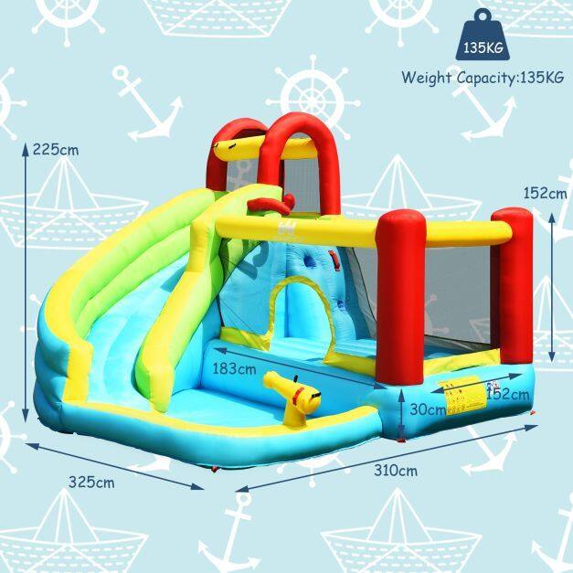 Reinforced Structure and Oxford Surface: The water slide is composed of echo-friendly 420D Oxford cloth with high strength that will bear weight up to 135 kg. Moreover, the sliding and climbing area are tightly sewed with reinforced 800D cloth that has no irritating odour and does no harm to your child’s skin. ASTM certificated.