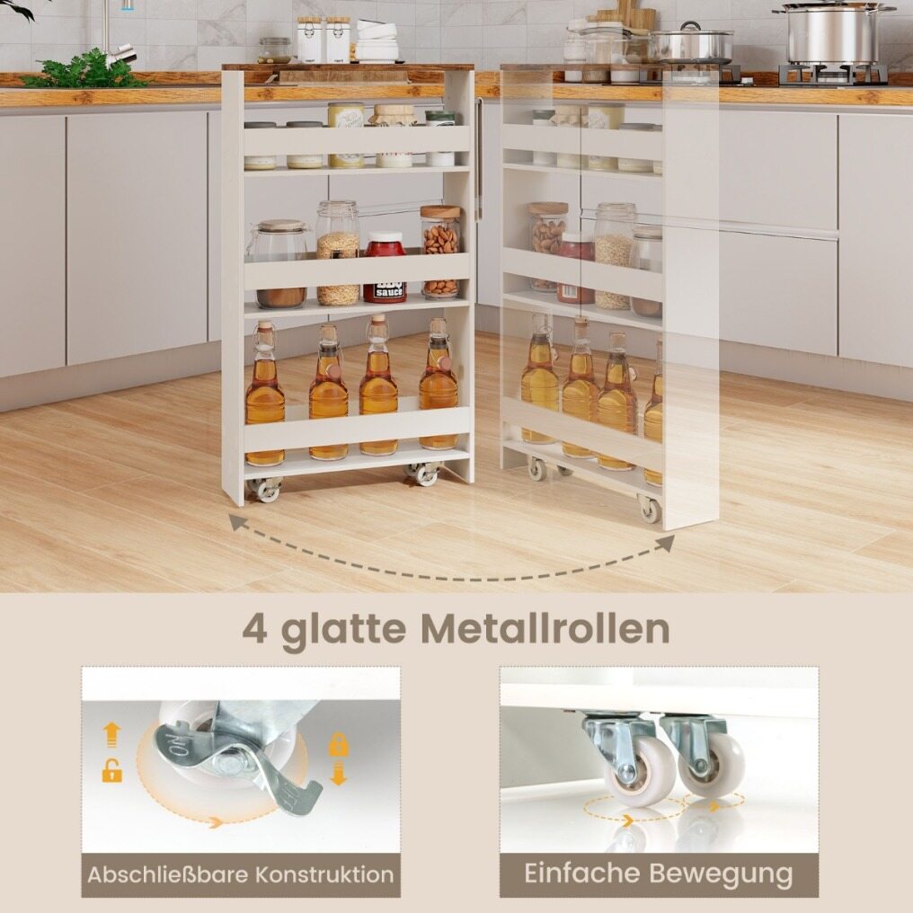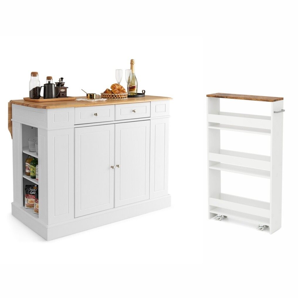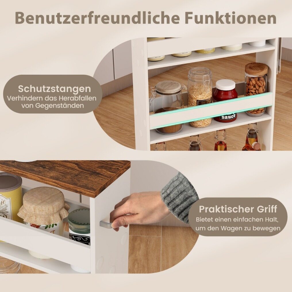 Ample storage space : In addition to the large rubberwood worktop, this kitchen island also features practical drawers, side shelves, and a two-door cabinet, providing plenty of storage for various kitchen utensils and keeping the room tidy and organized. The four-tier multi-purpose cart offers sufficient storage space, allowing you to neatly store and categorize items such as small spice jars, spices, and various beverage bottles. Furthermore, the safety bars on each shelf effectively prevent items from falling.