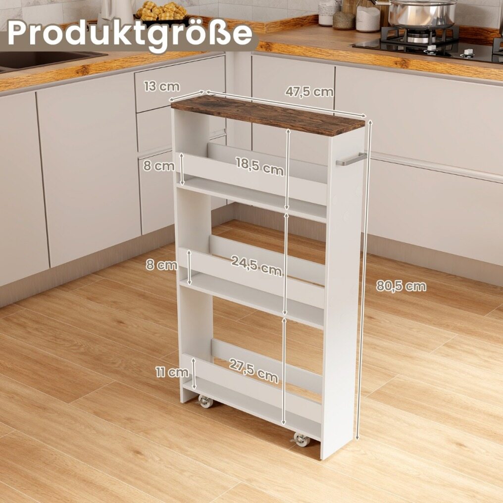 Folding rubberwood worktop : Unlike other folding wooden designs, this kitchen island table features high-quality folding metal legs for ease of use, allowing you to extend it to expand your prep space or lower it to fit into tight corners. The worktop is made of rubberwood with a maximum weight capacity of 200 kg. Measuring 47.5 x 13 x 80.5 cm (L x W x H), this slim kitchen cart fits effortlessly into narrow spaces, optimizing storage in compact areas.