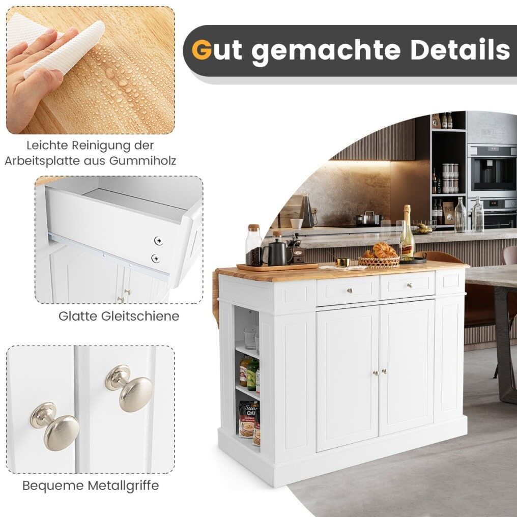This kitchen island combines functionality and aesthetics in one and is a great choice for your home! Struggling to find space for all your kitchen essentials? Don't worry! Our kitchen island table features a large rubberwood worktop, practical drawers, side shelves, and a two-door cabinet for ample storage. The shelves in the side cabinet and the cabinet are adjustable to three different heights to suit your storage needs. With four storage levels, the cart offers a practical way to organize various items. Whether you need to store kitchen utensils, office supplies, crafts, or other items, this cart is up to the task.