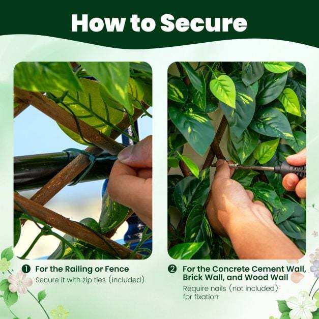 Secure Attachment: The package includes several zip ties for securing the grass wall panels to railingsor fences, or you can easily hang on walls with nails (not included). It is suitable for the concrete cement wall, brick wall, and wood wall, offering flexibility in placement.