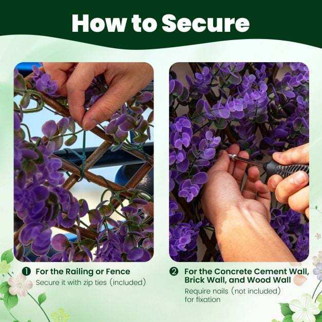Secure Attachment: The package includes several zip ties for securing the grass wall panels to railings or fences, or you can easily hang on walls with nails (not included). It is suitable for the concrete cement wall, brick wall, and wood wall, offering flexibility in placement.