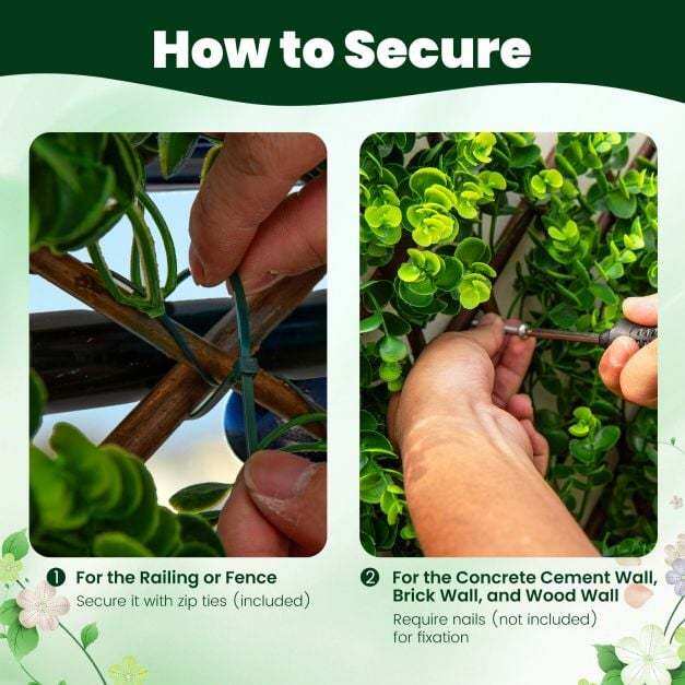 Secure Attachment: The package includes several zip ties for securing the grass wall panels to railings or fences, or you can easily hang on walls with nails (not included). It is suitable for the concrete cement wall, brick wall, and wood wall, offering flexibility in placement.
