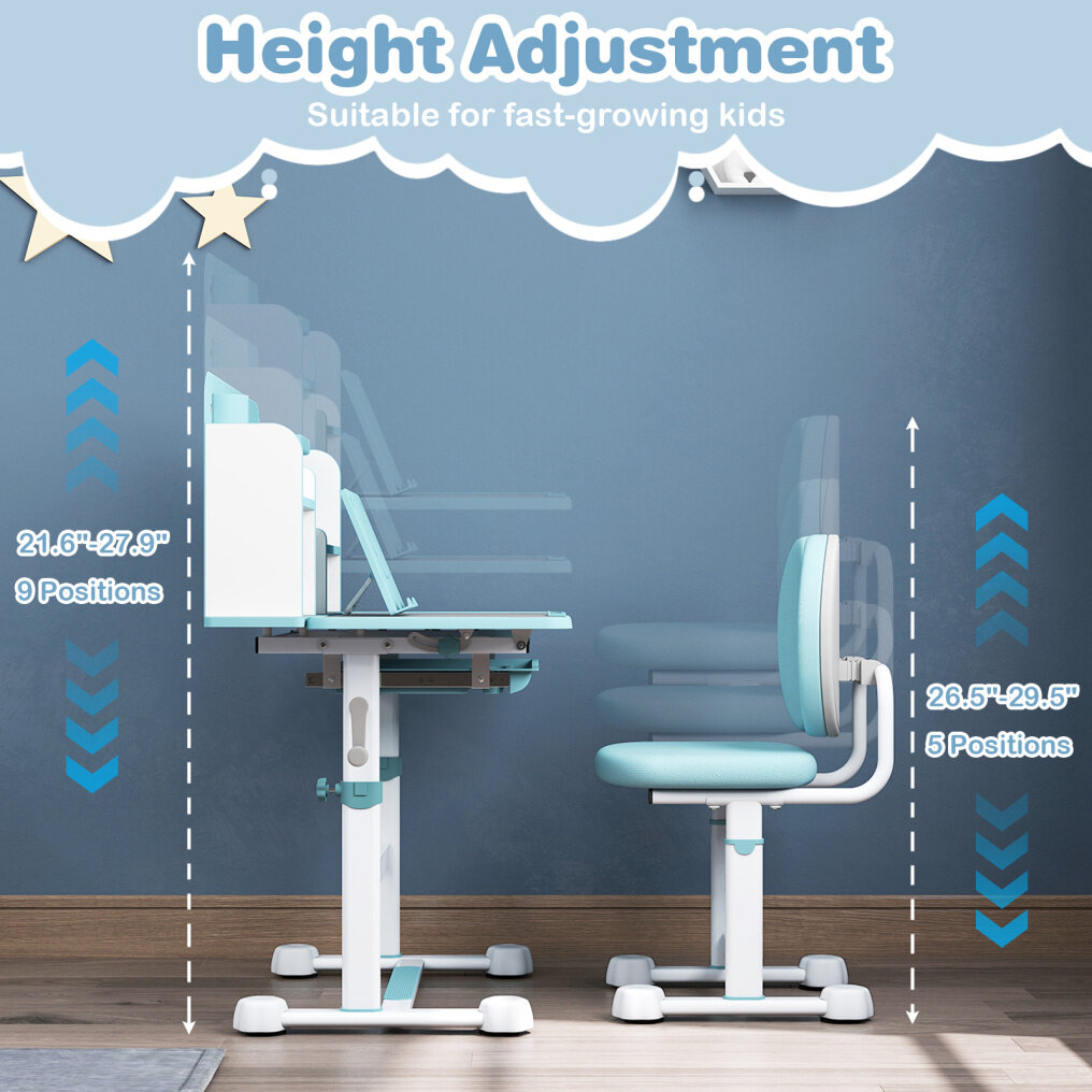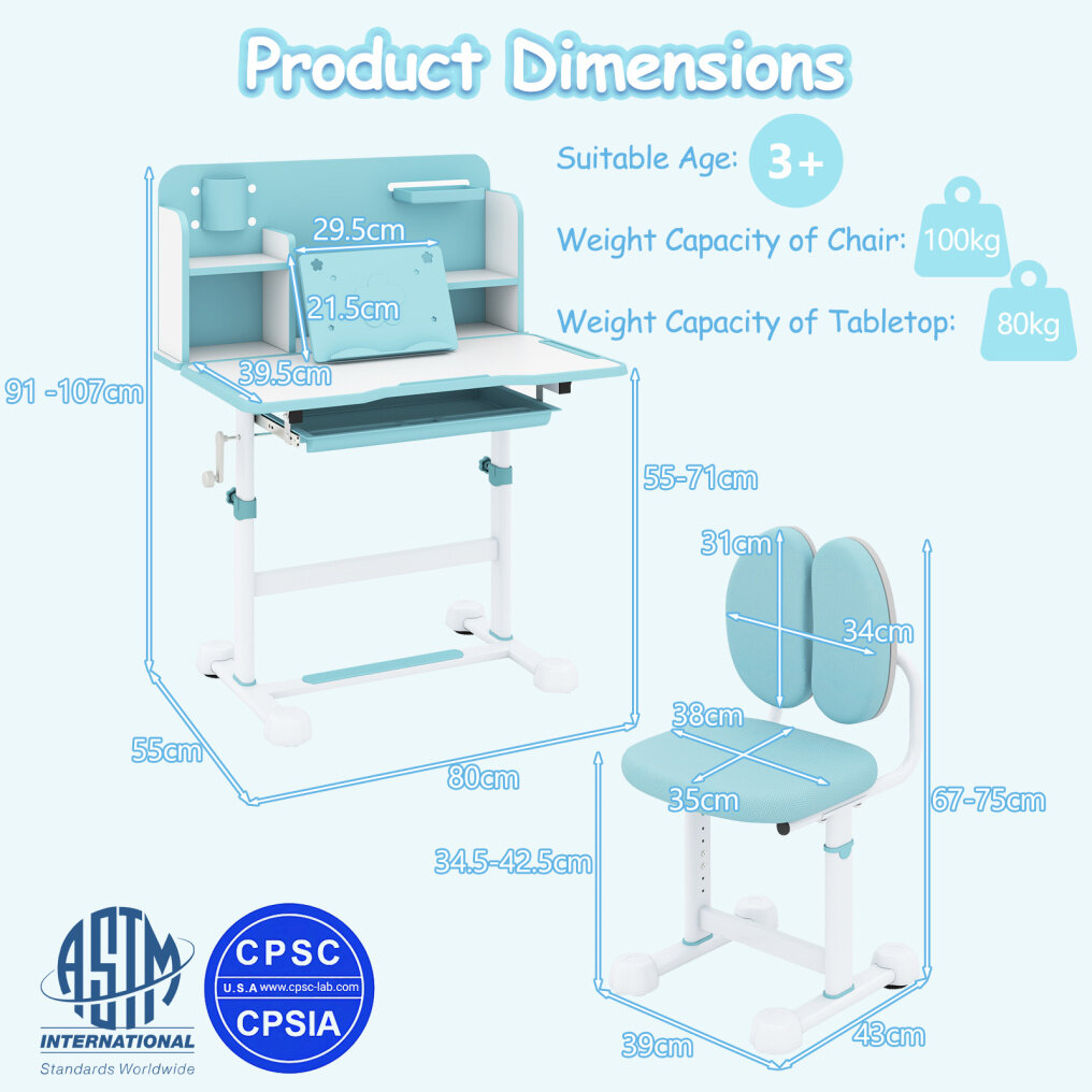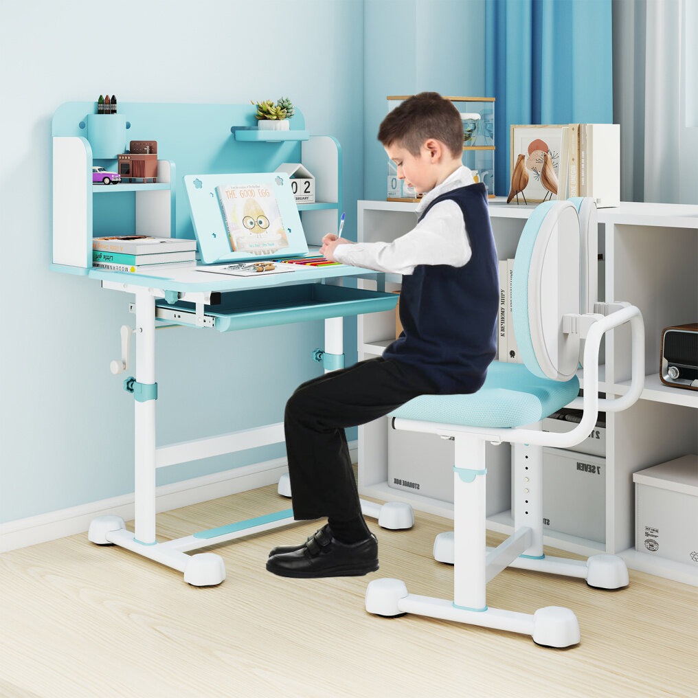 Adjustable Height for Growing Kids: The table can be adjusted in 9 positions, while the chair can be fixed in 5 positions, which will accompany your little one to grow up. The hand crank makes it easy to raise or lower the study desk.